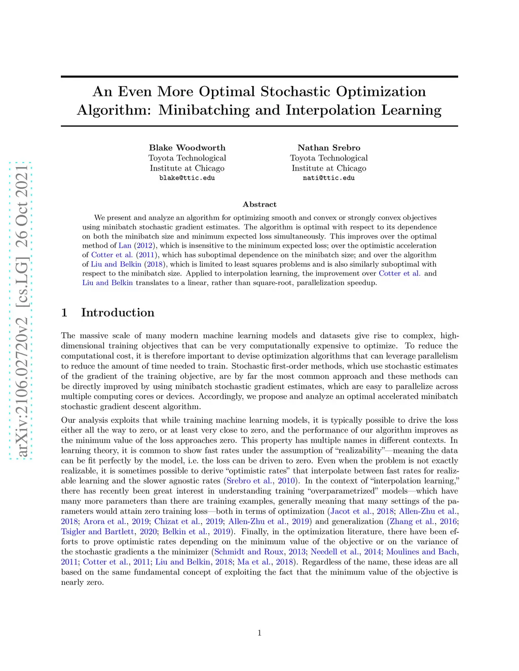 We present and analyze an algorithm for optimizing smooth and convex or strongly convex objectives using minibatch stochastic gradient estimates. The algorithm is optimal with respect to its dependence on both the minibatch size and minimum expected loss simultaneously. This improves over the optimal method of Lan (2012), which is insensitive to the minimum expected loss; over the optimistic acceleration of Cotter et al. (2011), which has suboptimal dependence on the minibatch size; and over the algorithm of Liu and Belkin (2018), which is limited to least squares problems and is also similarly suboptimal with respect to the minibatch size. Applied to interpolation learning, the improvement over Cotter et al. and Liu and Belkin translates to a linear, rather than square-root, parallelization speedup.