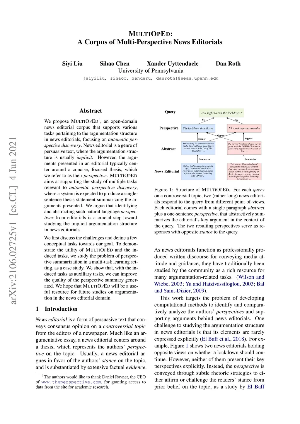 We propose MultiOpEd, an open-domain news editorial corpus that supports various tasks pertaining to the argumentation structure in news editorials, focusing on automatic perspective discovery. News editorial is a genre of persuasive text, where the argumentation structure is usually implicit. However, the arguments presented in an editorial typically center around a concise, focused thesis, which we refer to as their perspective. MultiOpEd aims at supporting the study of multiple tasks relevant to automatic perspective discovery, where a system is expected to produce a single-sentence thesis statement summarizing the arguments presented. We argue that identifying and abstracting such natural language perspectives from editorials is a crucial step toward studying the implicit argumentation structure in news editorials. We first discuss the challenges and define a few conceptual tasks towards our goal. To demonstrate the utility of MultiOpEd and the induced tasks, we study the problem of perspective summarization in a multi-task learning setting, as a case study. We show that, with the induced tasks as auxiliary tasks, we can improve the quality of the perspective summary generated. We hope that MultiOpEd will be a useful resource for future studies on argumentation in the news editorial domain.