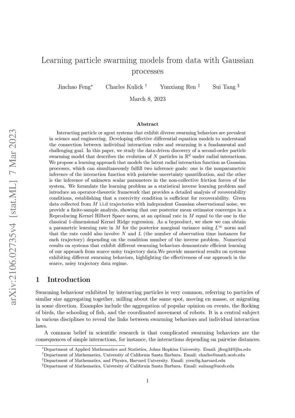 Interacting particle or agent systems that display a rich variety of swarming behaviours are ubiquitous in science and engineering. A fundamental and challenging goal is to understand the link between individual interaction rules and swarming. In this paper, we study the data-driven discovery of a second-order particle swarming model that describes the evolution of particles in under radial interactions. We propose a learning approach that models the latent radial interaction function as Gaussian processes, which can simultaneously fulfill two inference goals: one is the nonparametric inference of {the} interaction function with pointwise uncertainty quantification, and the other one is the inference of unknown scalar parameters in the non-collective friction forces of the system. We formulate the learning problem as a statistical inverse problem and provide a detailed analysis of recoverability conditions, establishing that a coercivity condition is sufficient for recoverability. Given data collected from i.i.d trajectories with independent Gaussian observational noise, we provide a finite-sample analysis, showing that our posterior mean estimator converges in a Reproducing kernel Hilbert space norm, at an optimal rate in equal to the one in the classical 1-dimensional Kernel Ridge regression. As a byproduct, we show we can obtain a parametric learning rate in for the posterior marginal variance using norm, and the rate could also involve and (the number of observation time instances for each trajectory), depending on the condition number of the inverse problem. Numerical results on systems that exhibit different swarming behaviors demonstrate efficient learning of our approach from scarce noisy trajectory data.