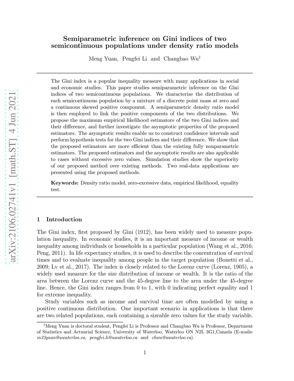 Semiparametric inference on Gini indices of two semicontinuous