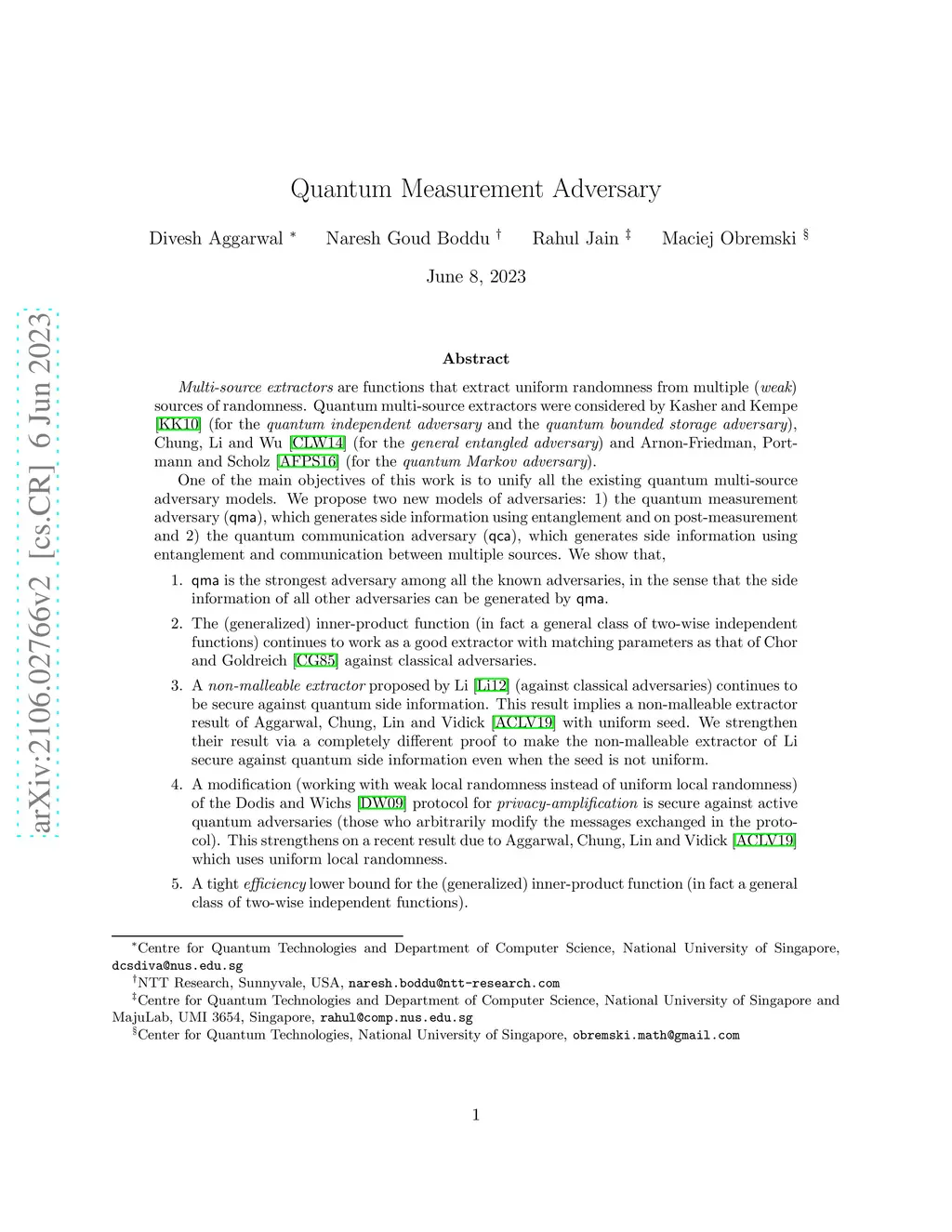 Multi-source-extractors are functions that extract uniform randomness from multiple (weak) sources of randomness. Quantum multi-source-extractors were considered by Kasher and Kempe (for the quantum-independent-adversary and the quantum-bounded-storage-adversary), Chung, Li and Wu (for the general-entangled-adversary) and Arnon-Friedman, Portmann and Scholz (for the quantum-Markov-adversary). One of the main objectives of this work is to unify all the existing quantum multi-source adversary models. We propose two new models of adversaries: 1) the quantum-measurement-adversary (qm-adv), which generates side-information using entanglement and on post-measurement and 2) the quantum-communication-adversary (qc-adv), which generates side-information using entanglement and communication between multiple sources. We show that, 1. qm-adv is the strongest adversary among all the known adversaries, in the sense that the side-information of all other adversaries can be generated by qm-adv. 2. The (generalized) inner-product function (in fact a general class of two-wise independent functions) continues to work as a good extractor against qm-adv with matching parameters as that of Chor and Goldreich. 3. A non-malleable-extractor proposed by Li (against classical-adversaries) continues to be secure against quantum side-information. This result implies a non-malleable-extractor result of Aggarwal, Chung, Lin and Vidick with uniform seed. We strengthen their result via a completely different proof to make the non-malleable-extractor of Li secure against quantum side-information even when the seed is not uniform. 4. A modification (working with weak sources instead of uniform sources) of the Dodis and Wichs protocol for privacy-amplification is secure against active quantum adversaries. This strengthens on a recent result due to Aggarwal, Chung, Lin and Vidick which uses uniform sources.