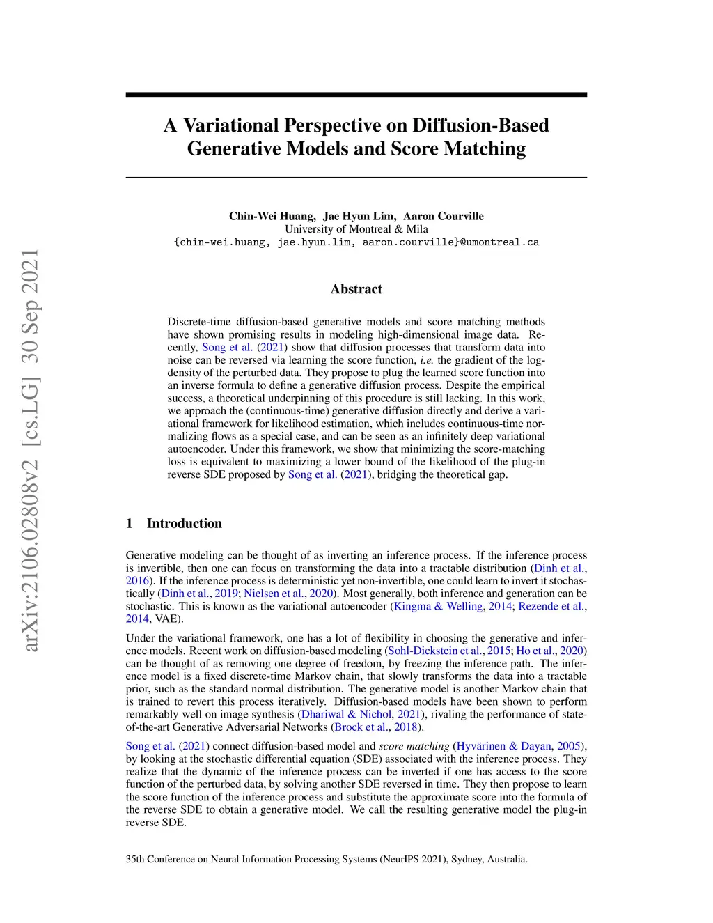 Discrete-time diffusion-based generative models and score matching methods have shown promising results in modeling high-dimensional image data. Recently, Song et al. (2021) show that diffusion processes that transform data into noise can be reversed via learning the score function, i.e. the gradient of the log-density of the perturbed data. They propose to plug the learned score function into an inverse formula to define a generative diffusion process. Despite the empirical success, a theoretical underpinning of this procedure is still lacking. In this work, we approach the (continuous-time) generative diffusion directly and derive a variational framework for likelihood estimation, which includes continuous-time normalizing flows as a special case, and can be seen as an infinitely deep variational autoencoder. Under this framework, we show that minimizing the score-matching loss is equivalent to maximizing a lower bound of the likelihood of the plug-in reverse SDE proposed by Song et al. (2021), bridging the theoretical gap.