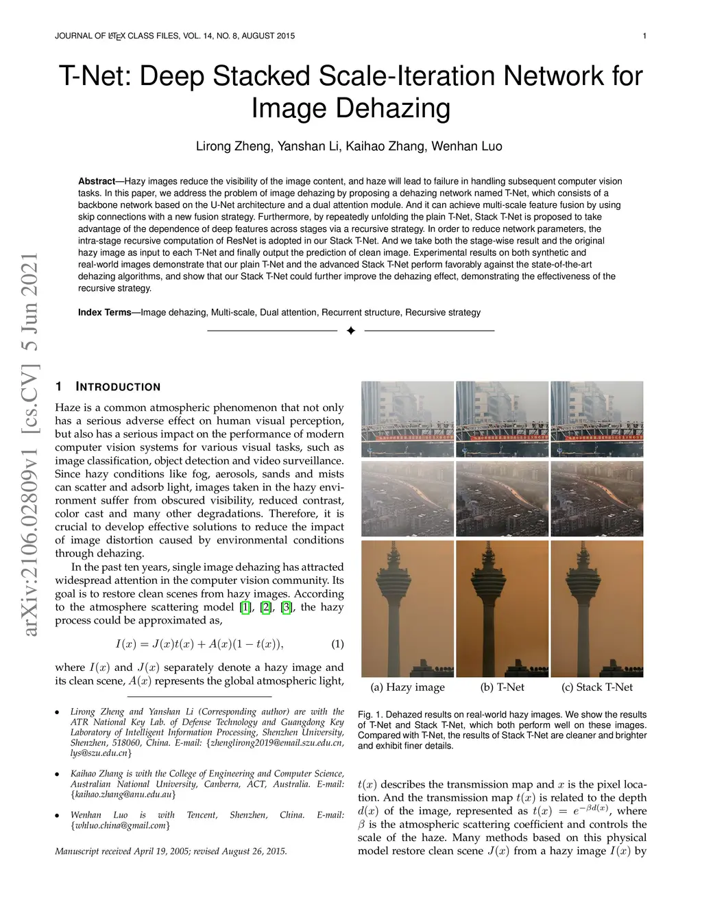 T-Net: Deep Stacked Scale-Iteration Network for Image Dehazing