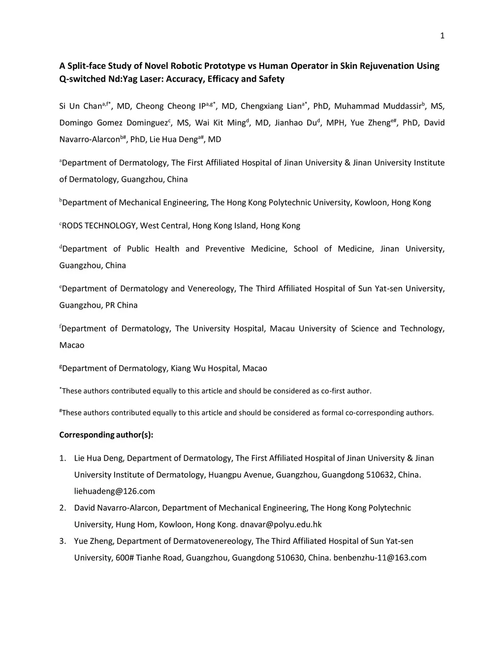 Background: Robotic technologies involved in skin laser are emerging. Objective: To compare the accuracy, efficacy and safety of novel robotic prototype with human operator in laser operation performance for skin photo-rejuvenation. Methods: Seventeen subjects were enrolled in a prospective, comparative split-face trial. Q-switch 1064nm laser conducted by the robotic prototype was provided on the right side of the face and that by the professional practitioner on the left. Each subject underwent a single time, one-pass, non-overlapped treatment on an equal size area of the forehead and cheek. Objective assessments included: treatment duration, laser irradiation shots, laser coverage percentage, VISIA parameters, skin temperature and the VAS pain scale. Results: Average time taken by robotic manipulator was longer than human operator; the average number of irradiation shots of both sides had no significant differences. Laser coverage rate of robotic manipulator (60.2 +-15.1%) was greater than that of human operator (43.6 +-12.9%). The VISIA parameters showed no significant differences between robotic manipulator and human operator. No short or long-term side effects were observed with maximum VAS score of 1 point. Limitations: Only one section of laser treatment was performed. Conclusion: Laser operation by novel robotic prototype is more reliable, stable and accurate than human operation.