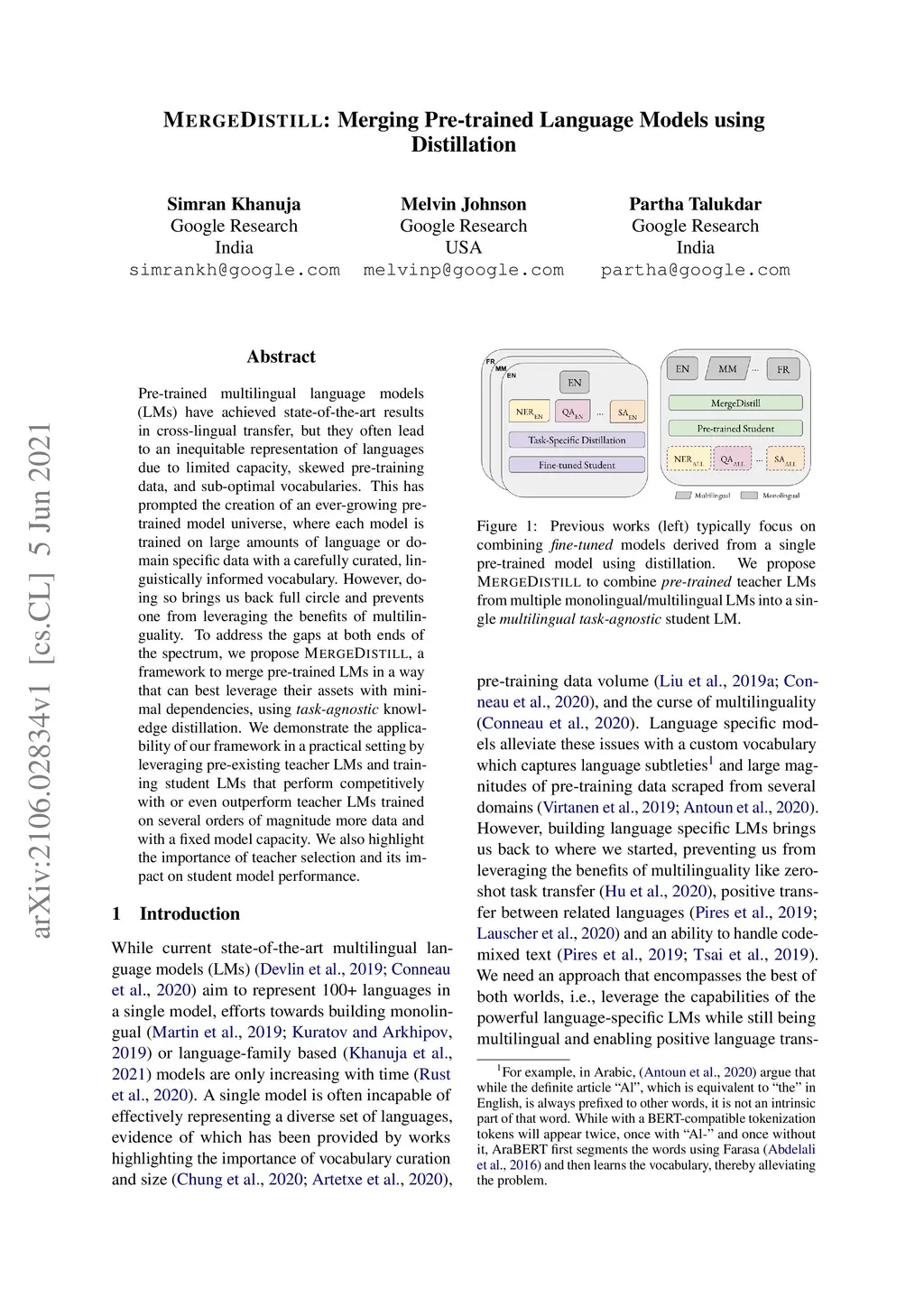 Pre-trained multilingual language models (LMs) have achieved state-of-the-art results in cross-lingual transfer, but they often lead to an inequitable representation of languages due to limited capacity, skewed pre-training data, and sub-optimal vocabularies. This has prompted the creation of an ever-growing pre-trained model universe, where each model is trained on large amounts of language or domain specific data with a carefully curated, linguistically informed vocabulary. However, doing so brings us back full circle and prevents one from leveraging the benefits of multilinguality. To address the gaps at both ends of the spectrum, we propose MergeDistill, a framework to merge pre-trained LMs in a way that can best leverage their assets with minimal dependencies, using task-agnostic knowledge distillation. We demonstrate the applicability of our framework in a practical setting by leveraging pre-existing teacher LMs and training student LMs that perform competitively with or even outperform teacher LMs trained on several orders of magnitude more data and with a fixed model capacity. We also highlight the importance of teacher selection and its impact on student model performance.