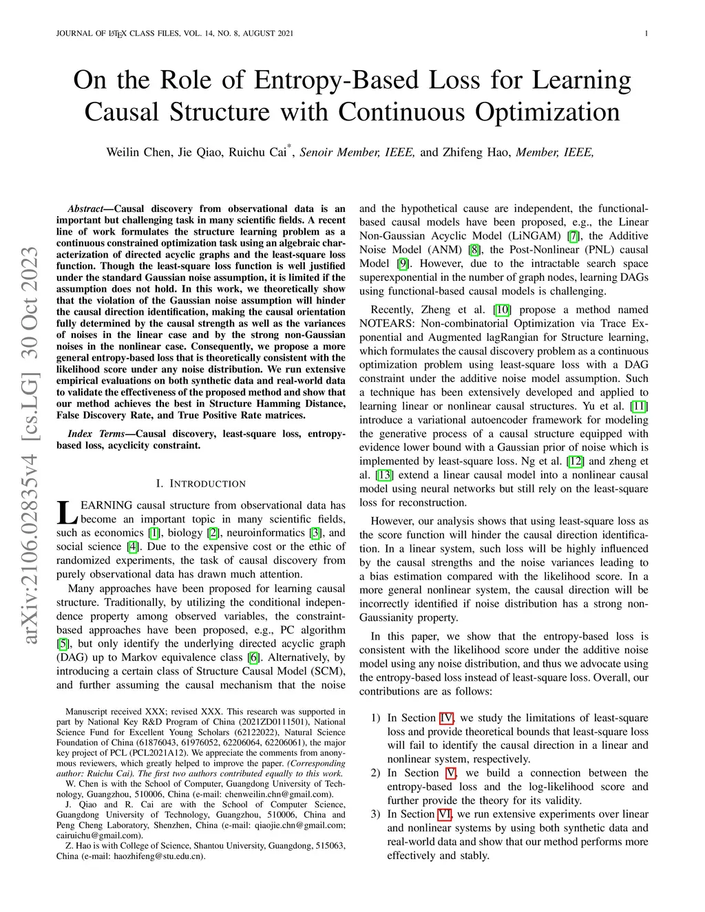 Causal discovery from observational data is an important but challenging task in many scientific fields. Recently, a method with non-combinatorial directed acyclic constraint, called NOTEARS, formulates the causal structure learning problem as a continuous optimization problem using least-square loss. Though the least-square loss function is well justified under the standard Gaussian noise assumption, it is limited if the assumption does not hold. In this work, we theoretically show that the violation of the Gaussian noise assumption will hinder the causal direction identification, making the causal orientation fully determined by the causal strength as well as the variances of noises in the linear case and by the strong non-Gaussian noises in the nonlinear case. Consequently, we propose a more general entropy-based loss that is theoretically consistent with the likelihood score under any noise distribution. We run extensive empirical evaluations on both synthetic data and real-world data to validate the effectiveness of the proposed method and show that our method achieves the best in Structure Hamming Distance, False Discovery Rate, and True Positive Rate matrices.