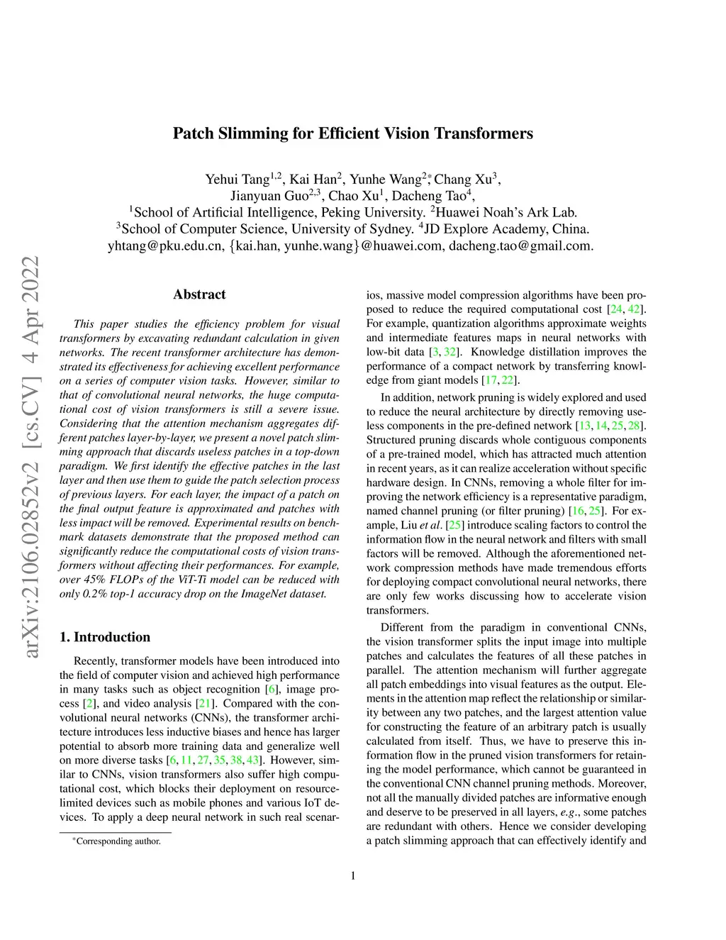 This paper studies the efficiency problem for visual transformers by excavating redundant calculation in given networks. The recent transformer architecture has demonstrated its effectiveness for achieving excellent performance on a series of computer vision tasks. However, similar to that of convolutional neural networks, the huge computational cost of vision transformers is still a severe issue. Considering that the attention mechanism aggregates different patches layer-by-layer, we present a novel patch slimming approach that discards useless patches in a top-down paradigm. We first identify the effective patches in the last layer and then use them to guide the patch selection process of previous layers. For each layer, the impact of a patch on the final output feature is approximated and patches with less impact will be removed. Experimental results on benchmark datasets demonstrate that the proposed method can significantly reduce the computational costs of vision transformers without affecting their performances. For example, over 45% FLOPs of the ViT-Ti model can be reduced with only 0.2% top-1 accuracy drop on the ImageNet dataset.