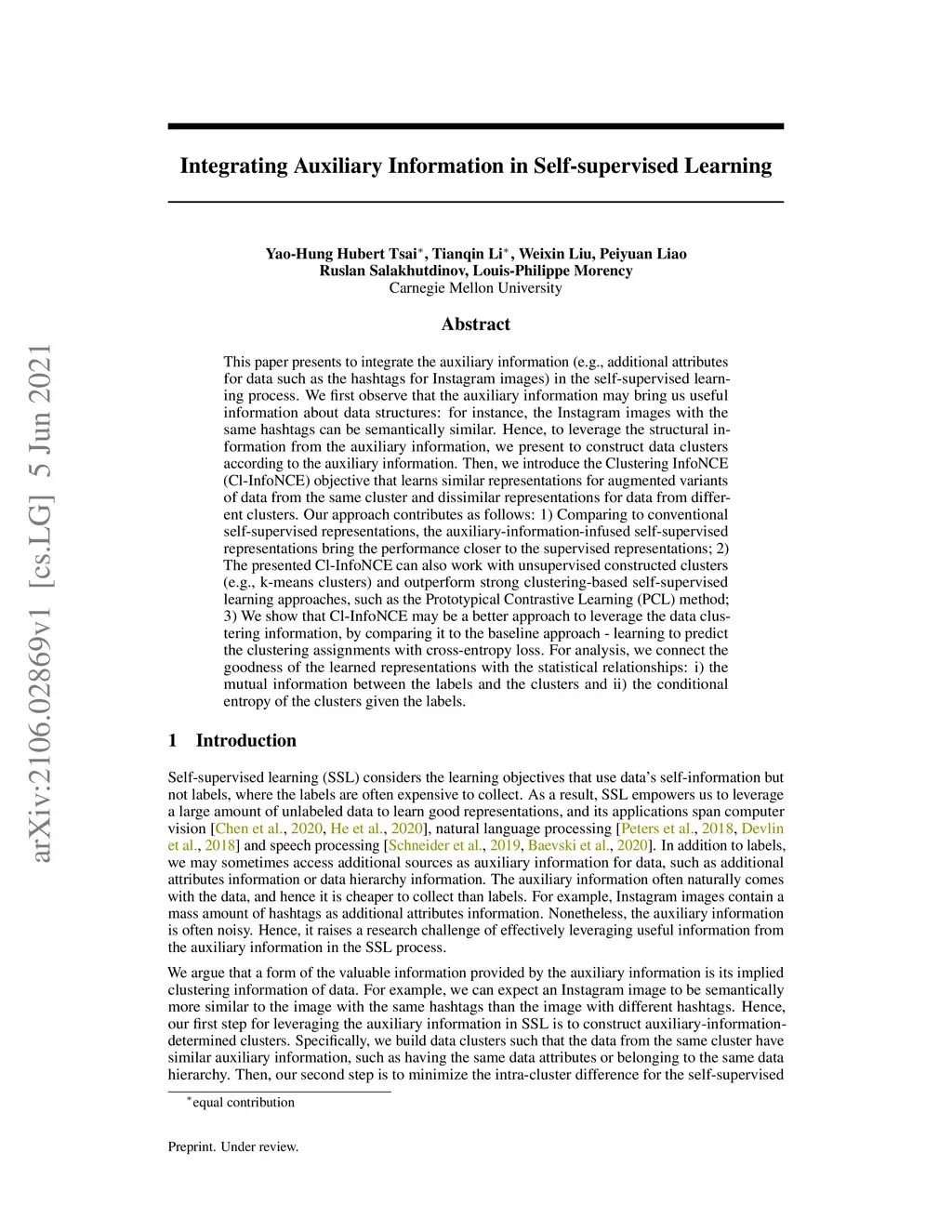 This paper presents to integrate the auxiliary information (e.g., additional attributes for data such as the hashtags for Instagram images) in the self-supervised learning process. We first observe that the auxiliary information may bring us useful information about data structures: for instance, the Instagram images with the same hashtags can be semantically similar. Hence, to leverage the structural information from the auxiliary information, we present to construct data clusters according to the auxiliary information. Then, we introduce the Clustering InfoNCE (Cl-InfoNCE) objective that learns similar representations for augmented variants of data from the same cluster and dissimilar representations for data from different clusters. Our approach contributes as follows: 1) Comparing to conventional self-supervised representations, the auxiliary-information-infused self-supervised representations bring the performance closer to the supervised representations; 2) The presented Cl-InfoNCE can also work with unsupervised constructed clusters (e.g., k-means clusters) and outperform strong clustering-based self-supervised learning approaches, such as the Prototypical Contrastive Learning (PCL) method; 3) We show that Cl-InfoNCE may be a better approach to leverage the data clustering information, by comparing it to the baseline approach - learning to predict the clustering assignments with cross-entropy loss. For analysis, we connect the goodness of the learned representations with the statistical relationships: i) the mutual information between the labels and the clusters and ii) the conditional entropy of the clusters given the labels.