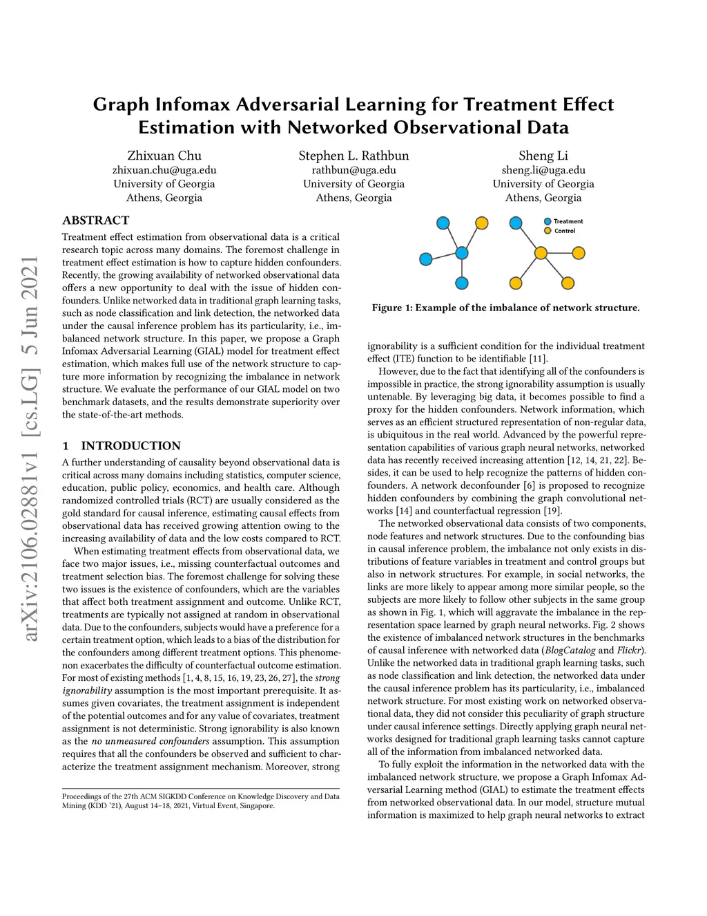 Treatment effect estimation from observational data is a critical research topic across many domains. The foremost challenge in treatment effect estimation is how to capture hidden confounders. Recently, the growing availability of networked observational data offers a new opportunity to deal with the issue of hidden confounders. Unlike networked data in traditional graph learning tasks, such as node classification and link detection, the networked data under the causal inference problem has its particularity, i.e., imbalanced network structure. In this paper, we propose a Graph Infomax Adversarial Learning (GIAL) model for treatment effect estimation, which makes full use of the network structure to capture more information by recognizing the imbalance in network structure. We evaluate the performance of our GIAL model on two benchmark datasets, and the results demonstrate superiority over the state-of-the-art methods.