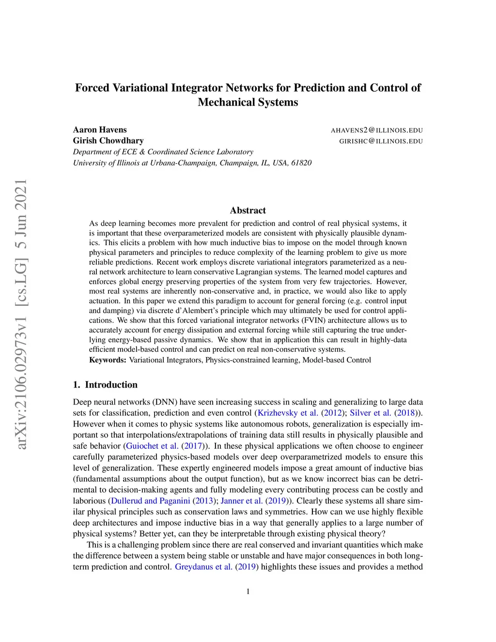 Forced Variational Integrator Networks for Prediction and Control of