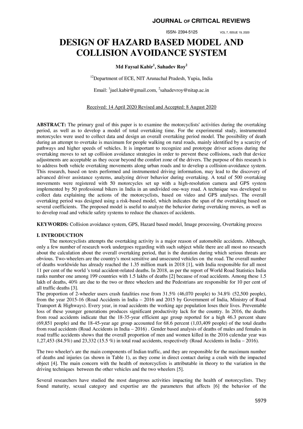 The primary goal of this paper is to examine the motorcyclists' activities during the overtaking period, as well as to develop a model of total overtaking time. For the experimental study, instrumented motorcycles were used to collect data and design an overall overtaking period model. The possibility of death during an attempt to overtake is maximum for people walking on rural roads, mainly identified by a scarcity of pathways and higher speeds of vehicles. It is important to recognize and prototype driver actions during the overtaking moves to set up collision avoidance strategies in order to prevent these collisions, such that device adjustments are acceptable as they occur beyond the comfort zone of the drivers. The purpose of this research is to address both vehicle overtaking movements along urban roads and to develop a collision avoidance system. This research, based on tests performed and instrumented driving information, may lead to the discovery of advanced driver assistance systems, analyzing driver behavior during overtaking. A total of 500 overtaking movements were registered with 50 motorcycles set up with a high-resolution camera and GPS system implemented by 50 professional bikers in India in an undivided one-way road. A technique was developed to collect data explaining the actions of the motorcyclists, based on video and GPS analyses. The overall overtaking period was designed using a risk-based model, which indicates the span of the overtaking based on several coefficients. The proposed model is useful to analyze the behavior during overtaking moves, as well as to develop road and vehicle safety systems to reduce the chances of accidents.