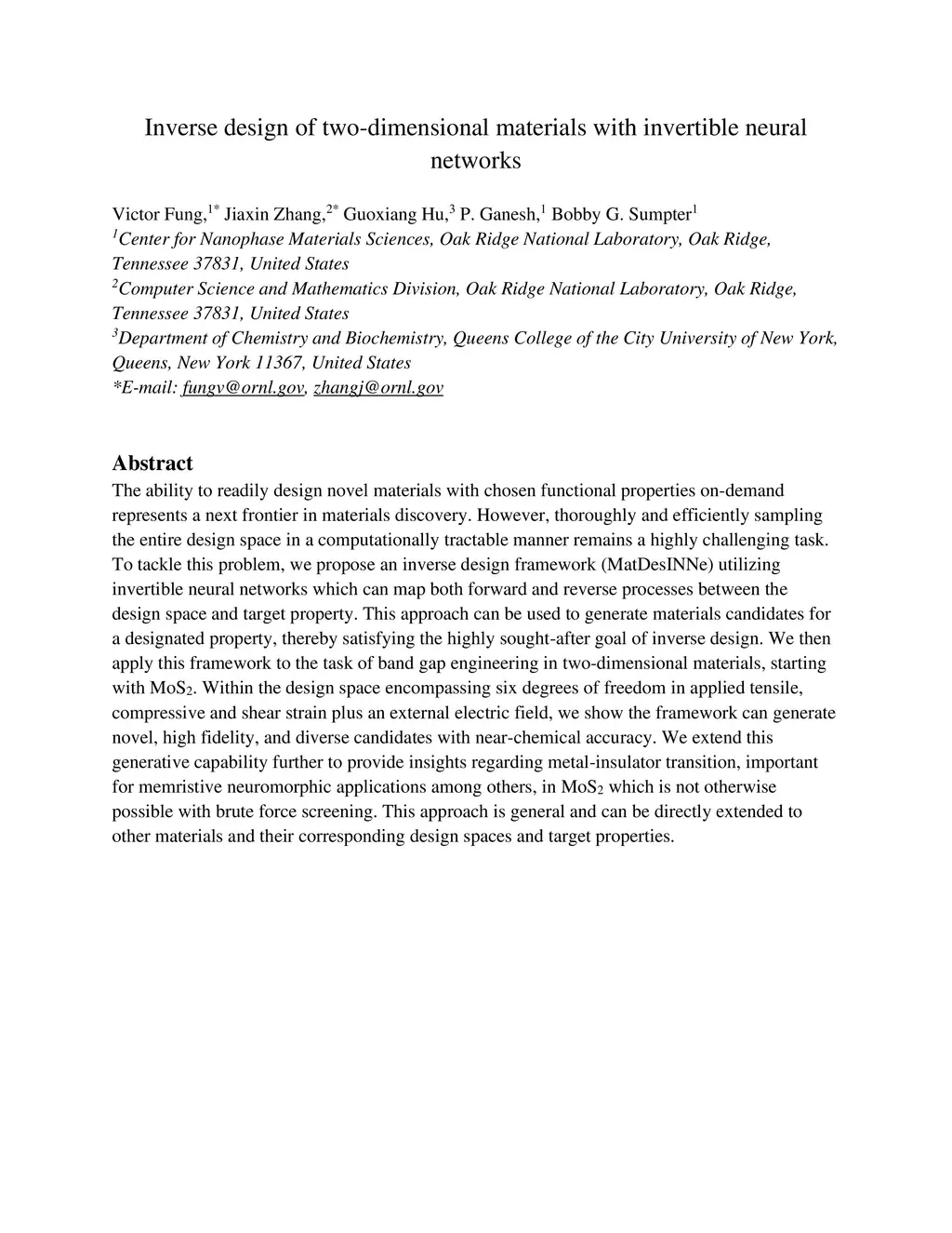 The ability to readily design novel materials with chosen functional properties on-demand represents a next frontier in materials discovery. However, thoroughly and efficiently sampling the entire design space in a computationally tractable manner remains a highly challenging task. To tackle this problem, we propose an inverse design framework (MatDesINNe) utilizing invertible neural networks which can map both forward and reverse processes between the design space and target property. This approach can be used to generate materials candidates for a designated property, thereby satisfying the highly sought-after goal of inverse design. We then apply this framework to the task of band gap engineering in two-dimensional materials, starting with MoS2. Within the design space encompassing six degrees of freedom in applied tensile, compressive and shear strain plus an external electric field, we show the framework can generate novel, high fidelity, and diverse candidates with near-chemical accuracy. We extend this generative capability further to provide insights regarding metal-insulator transition, important for memristive neuromorphic applications among others, in MoS2 which is not otherwise possible with brute force screening. This approach is general and can be directly extended to other materials and their corresponding design spaces and target properties.