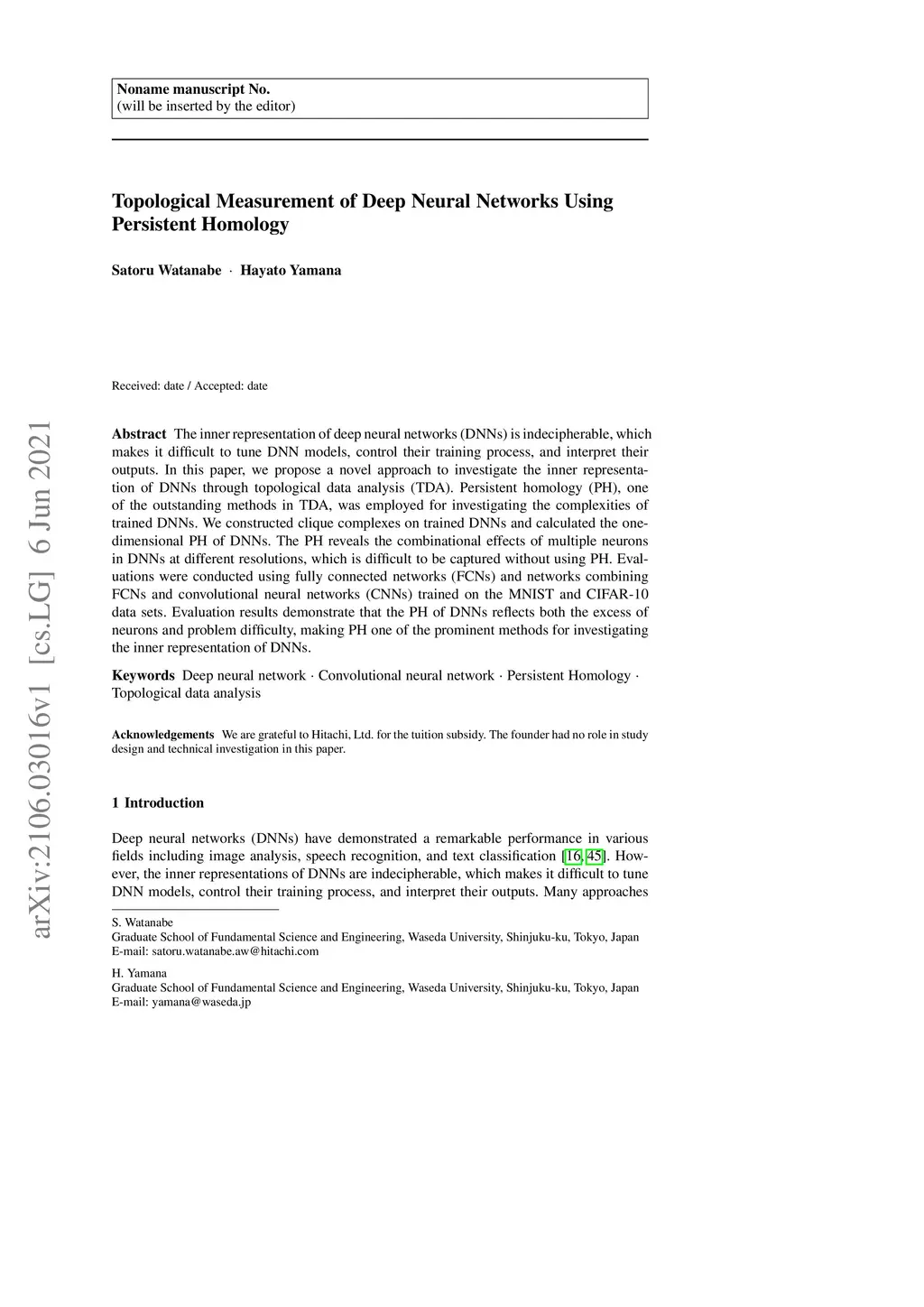 The inner representation of deep neural networks (DNNs) is indecipherable, which makes it difficult to tune DNN models, control their training process, and interpret their outputs. In this paper, we propose a novel approach to investigate the inner representation of DNNs through topological data analysis (TDA). Persistent homology (PH), one of the outstanding methods in TDA, was employed for investigating the complexities of trained DNNs. We constructed clique complexes on trained DNNs and calculated the one-dimensional PH of DNNs. The PH reveals the combinational effects of multiple neurons in DNNs at different resolutions, which is difficult to be captured without using PH. Evaluations were conducted using fully connected networks (FCNs) and networks combining FCNs and convolutional neural networks (CNNs) trained on the MNIST and CIFAR-10 data sets. Evaluation results demonstrate that the PH of DNNs reflects both the excess of neurons and problem difficulty, making PH one of the prominent methods for investigating the inner representation of DNNs.