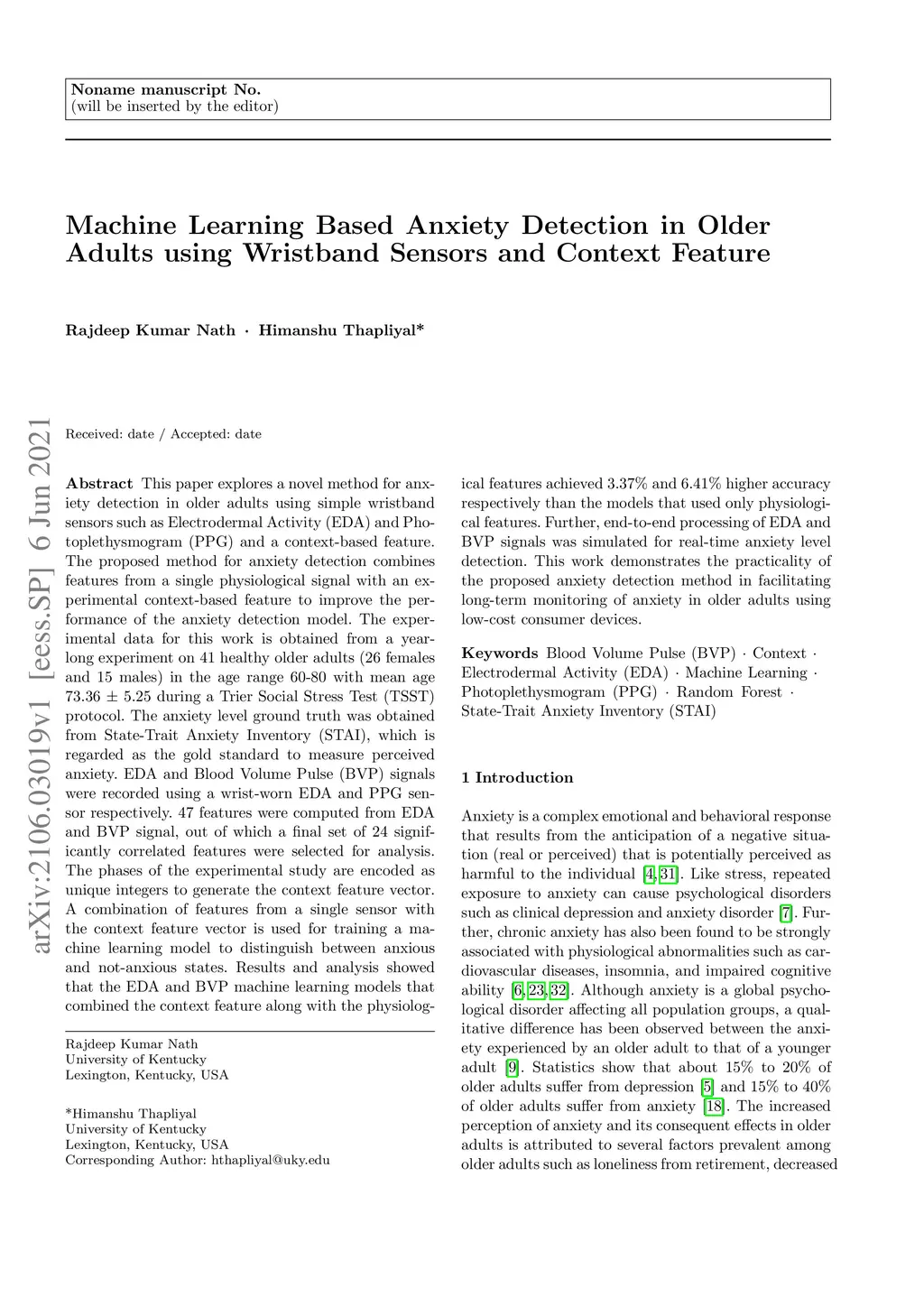 Machine Learning Based Anxiety Detection in Older Adults using Wristband