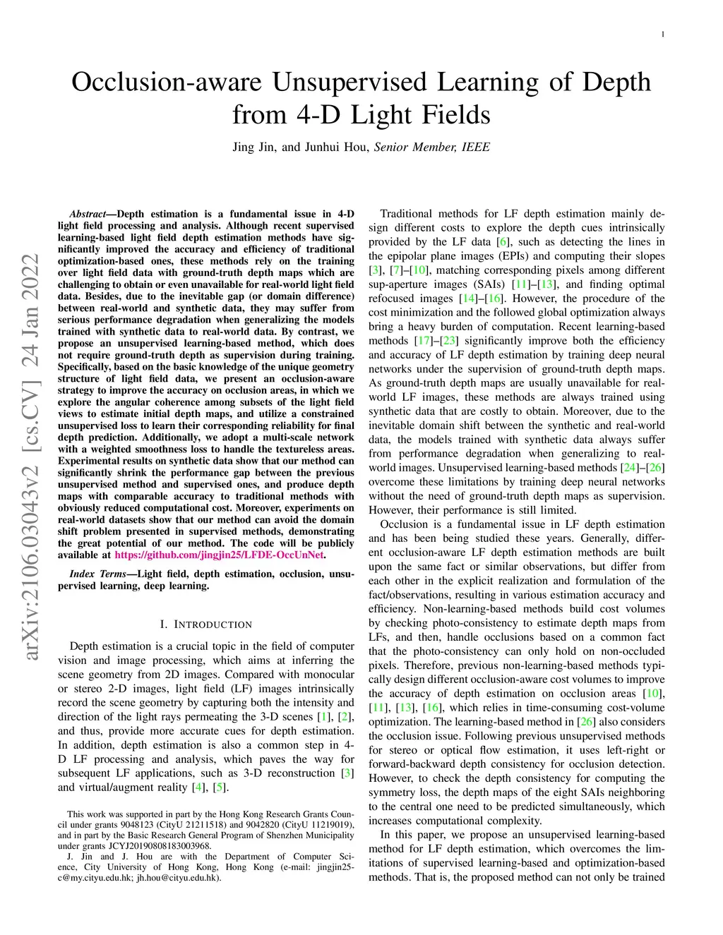 Occlusion-aware Unsupervised Learning of Depth from 4-D Light Fields