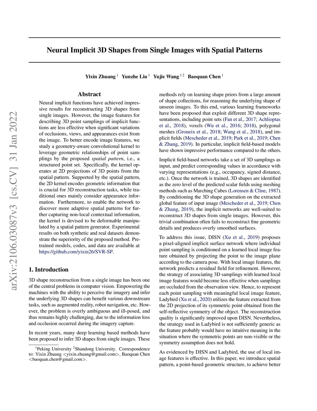 Neural Implicit 3D Shapes from Single Images with Spatial Patterns