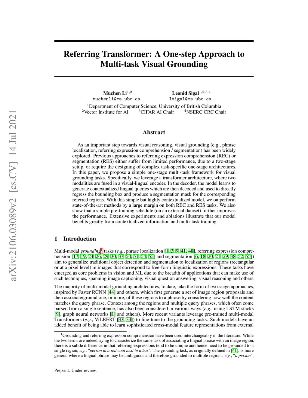 As an important step towards visual reasoning, visual grounding (e.g., phrase localization, referring expression comprehension/segmentation) has been widely explored Previous approaches to referring expression comprehension (REC) or segmentation (RES) either suffer from limited performance, due to a two-stage setup, or require the designing of complex task-specific one-stage architectures. In this paper, we propose a simple one-stage multi-task framework for visual grounding tasks. Specifically, we leverage a transformer architecture, where two modalities are fused in a visual-lingual encoder. In the decoder, the model learns to generate contextualized lingual queries which are then decoded and used to directly regress the bounding box and produce a segmentation mask for the corresponding referred regions. With this simple but highly contextualized model, we outperform state-of-the-arts methods by a large margin on both REC and RES tasks. We also show that a simple pre-training schedule (on an external dataset) further improves the performance. Extensive experiments and ablations illustrate that our model benefits greatly from contextualized information and multi-task training.