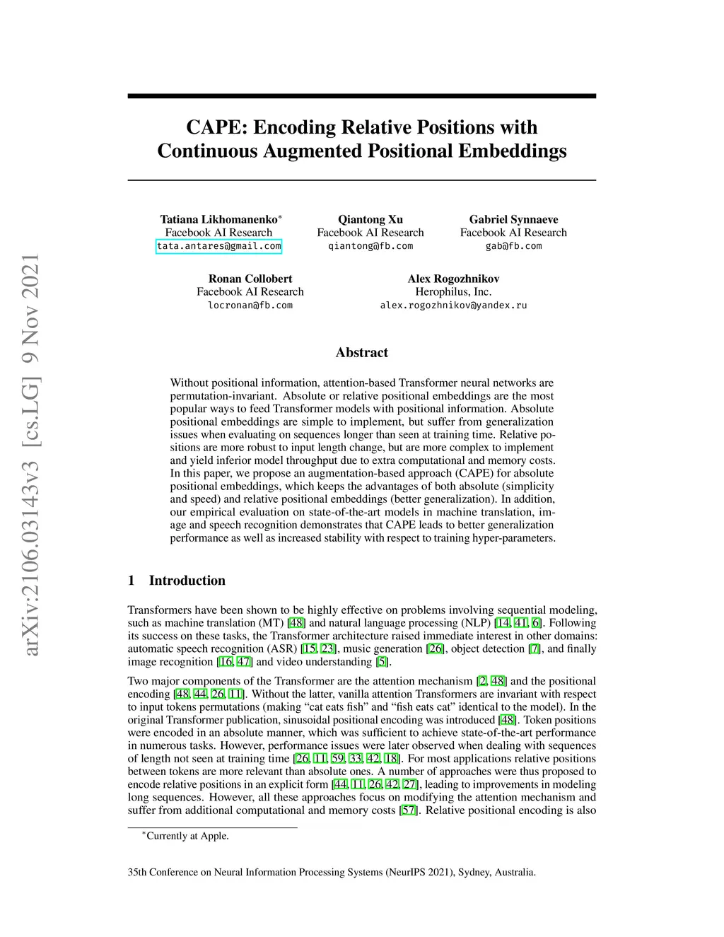 CAPE: Encoding Relative Positions with Continuous Augmented Positional