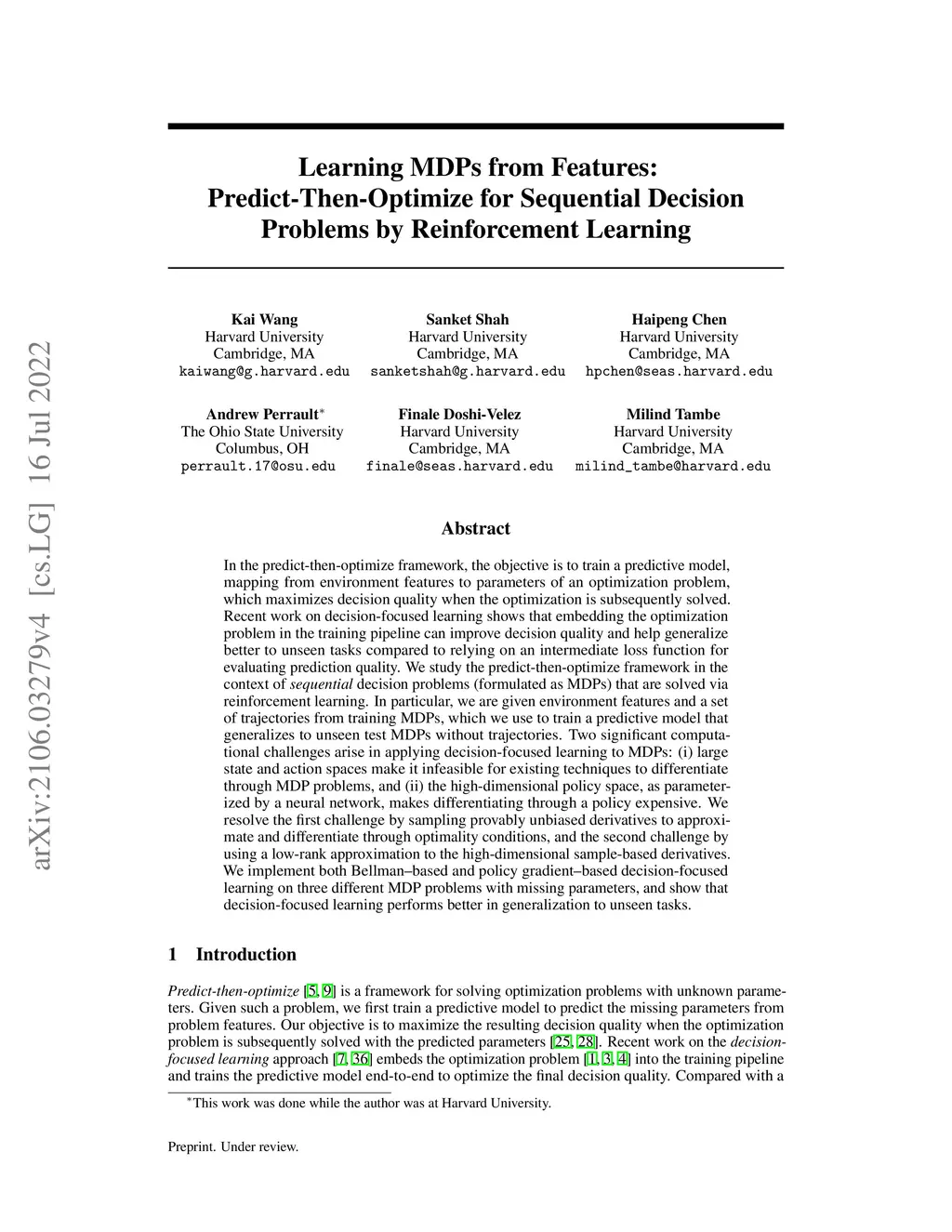 In the predict-then-optimize framework, the objective is to train a predictive model, mapping from environment features to parameters of an optimization problem, which maximizes decision quality when the optimization is subsequently solved. Recent work on decision-focused learning shows that embedding the optimization problem in the training pipeline can improve decision quality and help generalize better to unseen tasks compared to relying on an intermediate loss function for evaluating prediction quality. We study the predict-then-optimize framework in the context of sequential decision problems (formulated as MDPs) that are solved via reinforcement learning. In particular, we are given environment features and a set of trajectories from training MDPs, which we use to train a predictive model that generalizes to unseen test MDPs without trajectories. Two significant computational challenges arise in applying decision-focused learning to MDPs: (i) large state and action spaces make it infeasible for existing techniques to differentiate through MDP problems, and (ii) the high-dimensional policy space, as parameterized by a neural network, makes differentiating through a policy expensive. We resolve the first challenge by sampling provably unbiased derivatives to approximate and differentiate through optimality conditions, and the second challenge by using a low-rank approximation to the high-dimensional sample-based derivatives. We implement both Bellman--based and policy gradient--based decision-focused learning on three different MDP problems with missing parameters, and show that decision-focused learning performs better in generalization to unseen tasks.