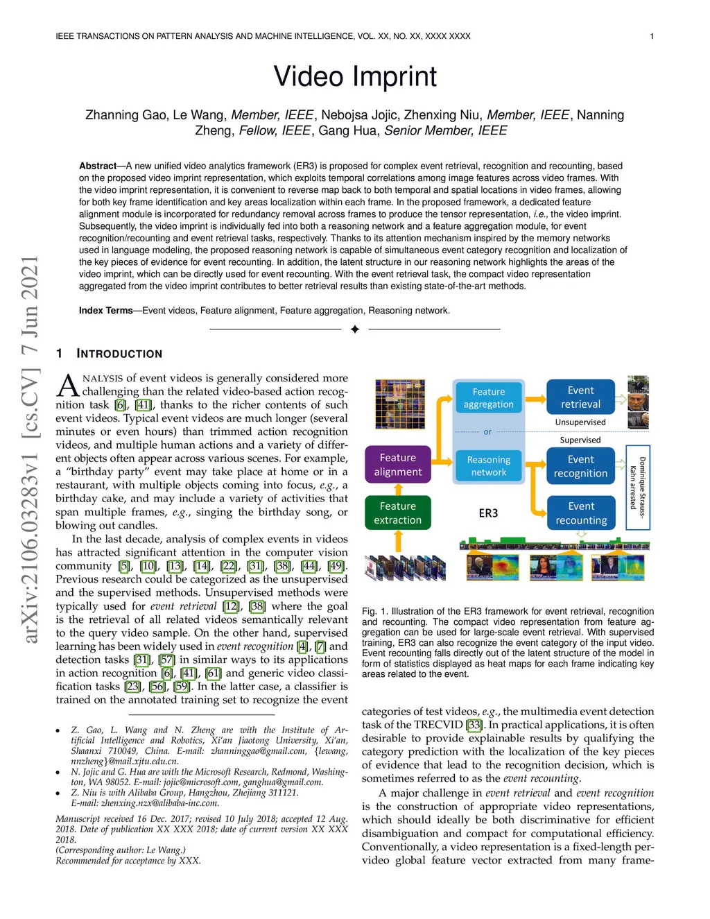 A new unified video analytics framework (ER3) is proposed for complex event retrieval, recognition and recounting, based on the proposed video imprint representation, which exploits temporal correlations among image features across video frames. With the video imprint representation, it is convenient to reverse map back to both temporal and spatial locations in video frames, allowing for both key frame identification and key areas localization within each frame. In the proposed framework, a dedicated feature alignment module is incorporated for redundancy removal across frames to produce the tensor representation, i.e., the video imprint. Subsequently, the video imprint is individually fed into both a reasoning network and a feature aggregation module, for event recognition/recounting and event retrieval tasks, respectively. Thanks to its attention mechanism inspired by the memory networks used in language modeling, the proposed reasoning network is capable of simultaneous event category recognition and localization of the key pieces of evidence for event recounting. In addition, the latent structure in our reasoning network highlights the areas of the video imprint, which can be directly used for event recounting. With the event retrieval task, the compact video representation aggregated from the video imprint contributes to better retrieval results than existing state-of-the-art methods.