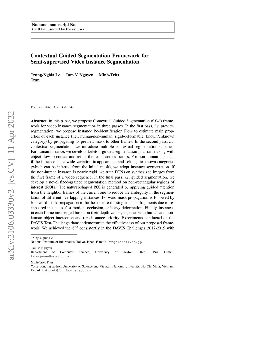 In this paper, we propose Contextual Guided Segmentation (CGS) framework for video instance segmentation in three passes. In the first pass, i.e., preview segmentation, we propose Instance Re-Identification Flow to estimate main properties of each instance (i.e., human/non-human, rigid/deformable, known/unknown category) by propagating its preview mask to other frames. In the second pass, i.e., contextual segmentation, we introduce multiple contextual segmentation schemes. For human instance, we develop skeleton-guided segmentation in a frame along with object flow to correct and refine the result across frames. For non-human instance, if the instance has a wide variation in appearance and belongs to known categories (which can be inferred from the initial mask), we adopt instance segmentation. If the non-human instance is nearly rigid, we train FCNs on synthesized images from the first frame of a video sequence. In the final pass, i.e., guided segmentation, we develop a novel fined-grained segmentation method on non-rectangular regions of interest (ROIs). The natural-shaped ROI is generated by applying guided attention from the neighbor frames of the current one to reduce the ambiguity in the segmentation of different overlapping instances. Forward mask propagation is followed by backward mask propagation to further restore missing instance fragments due to re-appeared instances, fast motion, occlusion, or heavy deformation. Finally, instances in each frame are merged based on their depth values, together with human and non-human object interaction and rare instance priority. Experiments conducted on the DAVIS Test-Challenge dataset demonstrate the effectiveness of our proposed framework. We achieved the 3rd consistently in the DAVIS Challenges 2017-2019 with 75.4%, 72.4%, and 78.4% in terms of global score, region similarity, and contour accuracy, respectively.