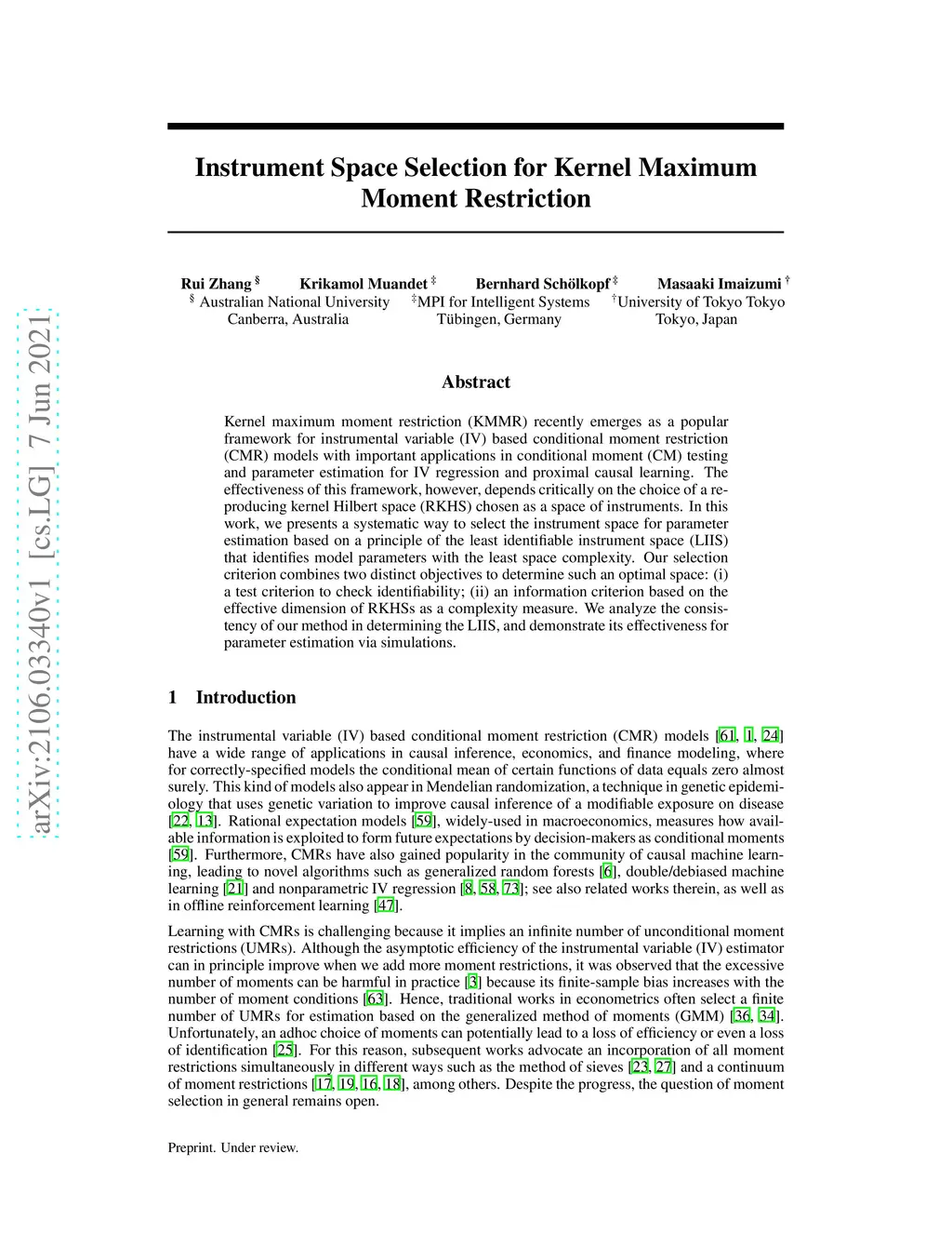 Kernel maximum moment restriction (KMMR) recently emerges as a popular framework for instrumental variable (IV) based conditional moment restriction (CMR) models with important applications in conditional moment (CM) testing and parameter estimation for IV regression and proximal causal learning. The effectiveness of this framework, however, depends critically on the choice of a reproducing kernel Hilbert space (RKHS) chosen as a space of instruments. In this work, we presents a systematic way to select the instrument space for parameter estimation based on a principle of the least identifiable instrument space (LIIS) that identifies model parameters with the least space complexity. Our selection criterion combines two distinct objectives to determine such an optimal space: (i) a test criterion to check identifiability; (ii) an information criterion based on the effective dimension of RKHSs as a complexity measure. We analyze the consistency of our method in determining the LIIS, and demonstrate its effectiveness for parameter estimation via simulations.