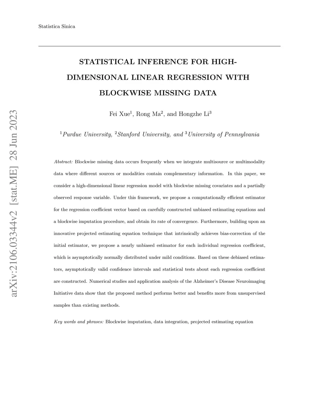 Blockwise missing data occurs frequently when we integrate multisource or multimodality data where different sources or modalities contain complementary information. In this paper, we consider a high-dimensional linear regression model with blockwise missing covariates and a partially observed response variable. Under this framework, we propose a computationally efficient estimator for the regression coefficient vector based on carefully constructed unbiased estimating equations and a blockwise imputation procedure, and obtain its rate of convergence. Furthermore, building upon an innovative projected estimating equation technique that intrinsically achieves bias-correction of the initial estimator, we propose a nearly unbiased estimator for each individual regression coefficient, which is asymptotically normally distributed under mild conditions. Based on these debiased estimators, asymptotically valid confidence intervals and statistical tests about each regression coefficient are constructed. Numerical studies and application analysis of the Alzheimer's Disease Neuroimaging Initiative data show that the proposed method performs better and benefits more from unsupervised samples than existing methods.