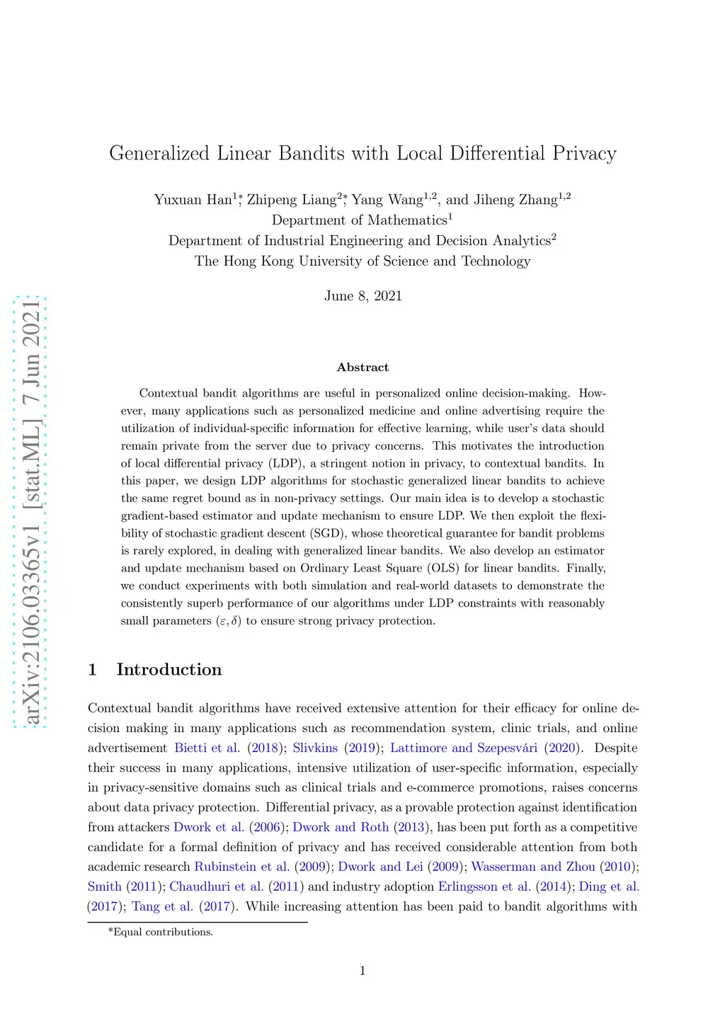 Contextual bandit algorithms are useful in personalized online decision-making. However, many applications such as personalized medicine and online advertising require the utilization of individual-specific information for effective learning, while user's data should remain private from the server due to privacy concerns. This motivates the introduction of local differential privacy (LDP), a stringent notion in privacy, to contextual bandits. In this paper, we design LDP algorithms for stochastic generalized linear bandits to achieve the same regret bound as in non-privacy settings. Our main idea is to develop a stochastic gradient-based estimator and update mechanism to ensure LDP. We then exploit the flexibility of stochastic gradient descent (SGD), whose theoretical guarantee for bandit problems is rarely explored, in dealing with generalized linear bandits. We also develop an estimator and update mechanism based on Ordinary Least Square (OLS) for linear bandits. Finally, we conduct experiments with both simulation and real-world datasets to demonstrate the consistently superb performance of our algorithms under LDP constraints with reasonably small parameters to ensure strong privacy protection.