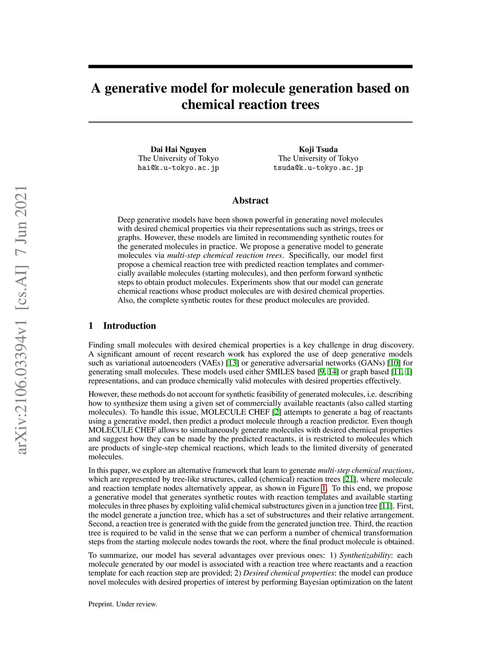 Deep generative models have been shown powerful in generating novel molecules with desired chemical properties via their representations such as strings, trees or graphs. However, these models are limited in recommending synthetic routes for the generated molecules in practice. We propose a generative model to generate molecules via multi-step chemical reaction trees. Specifically, our model first propose a chemical reaction tree with predicted reaction templates and commercially available molecules (starting molecules), and then perform forward synthetic steps to obtain product molecules. Experiments show that our model can generate chemical reactions whose product molecules are with desired chemical properties. Also, the complete synthetic routes for these product molecules are provided.