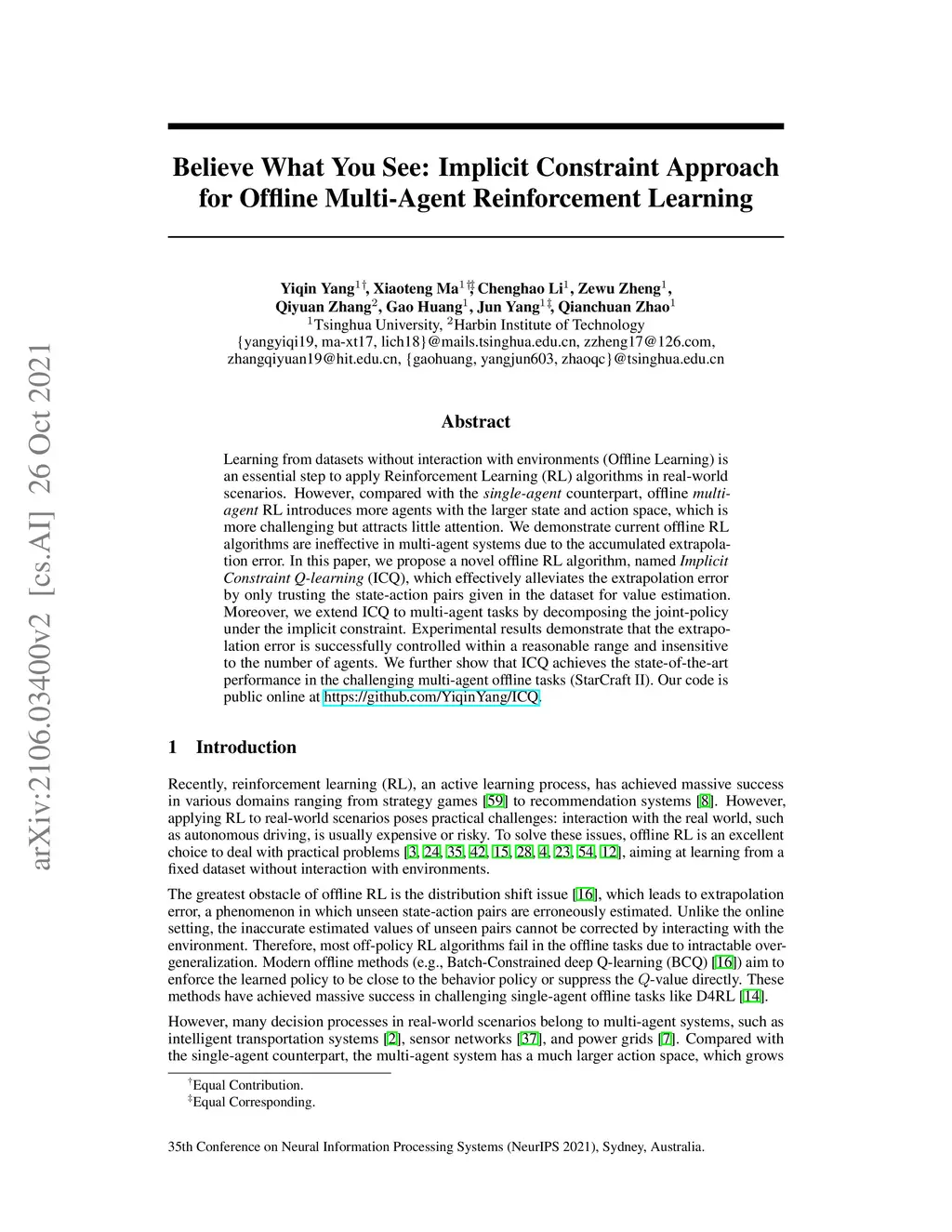 Learning from datasets without interaction with environments (Offline Learning) is an essential step to apply Reinforcement Learning (RL) algorithms in real-world scenarios. However, compared with the single-agent counterpart, offline multi-agent RL introduces more agents with the larger state and action space, which is more challenging but attracts little attention. We demonstrate current offline RL algorithms are ineffective in multi-agent systems due to the accumulated extrapolation error. In this paper, we propose a novel offline RL algorithm, named Implicit Constraint Q-learning (ICQ), which effectively alleviates the extrapolation error by only trusting the state-action pairs given in the dataset for value estimation. Moreover, we extend ICQ to multi-agent tasks by decomposing the joint-policy under the implicit constraint. Experimental results demonstrate that the extrapolation error is successfully controlled within a reasonable range and insensitive to the number of agents. We further show that ICQ achieves the state-of-the-art performance in the challenging multi-agent offline tasks (StarCraft II). Our code is public online at https://github.com/YiqinYang/ICQ.