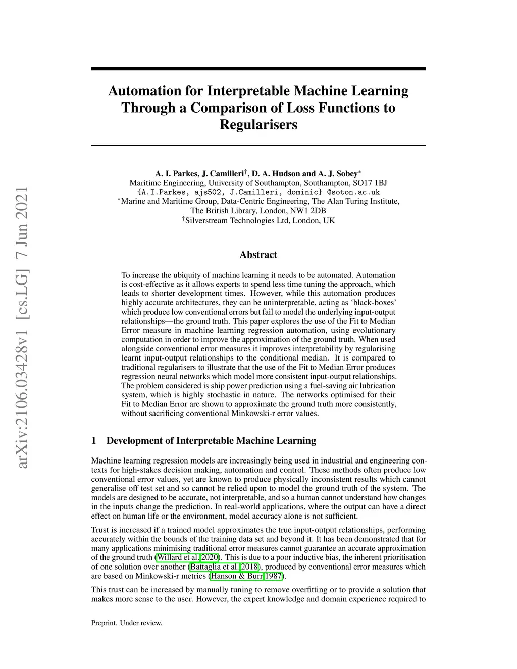 To increase the ubiquity of machine learning it needs to be automated. Automation is cost-effective as it allows experts to spend less time tuning the approach, which leads to shorter development times. However, while this automation produces highly accurate architectures, they can be uninterpretable, acting as `black-boxes' which produce low conventional errors but fail to model the underlying input-output relationships -- the ground truth. This paper explores the use of the Fit to Median Error measure in machine learning regression automation, using evolutionary computation in order to improve the approximation of the ground truth. When used alongside conventional error measures it improves interpretability by regularising learnt input-output relationships to the conditional median. It is compared to traditional regularisers to illustrate that the use of the Fit to Median Error produces regression neural networks which model more consistent input-output relationships. The problem considered is ship power prediction using a fuel-saving air lubrication system, which is highly stochastic in nature. The networks optimised for their Fit to Median Error are shown to approximate the ground truth more consistently, without sacrificing conventional Minkowski-r error values.