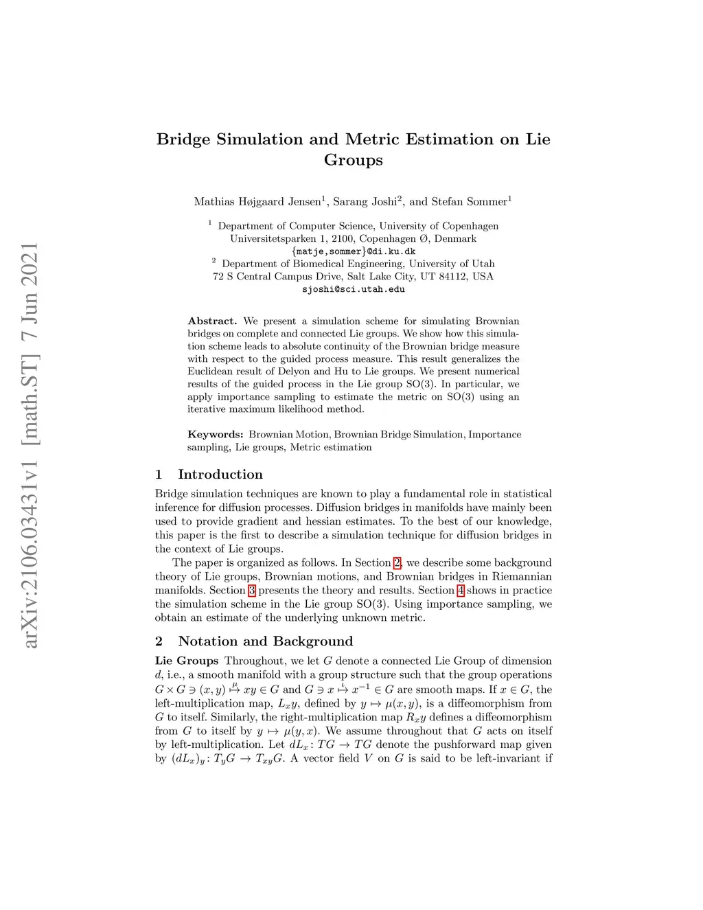 We present a simulation scheme for simulating Brownian bridges on complete and connected Lie groups. We show how this simulation scheme leads to absolute continuity of the Brownian bridge measure with respect to the guided process measure. This result generalizes the Euclidean result of Delyon and Hu to Lie groups. We present numerical results of the guided process in the Lie group . In particular, we apply importance sampling to estimate the metric on using an iterative maximum likelihood method.