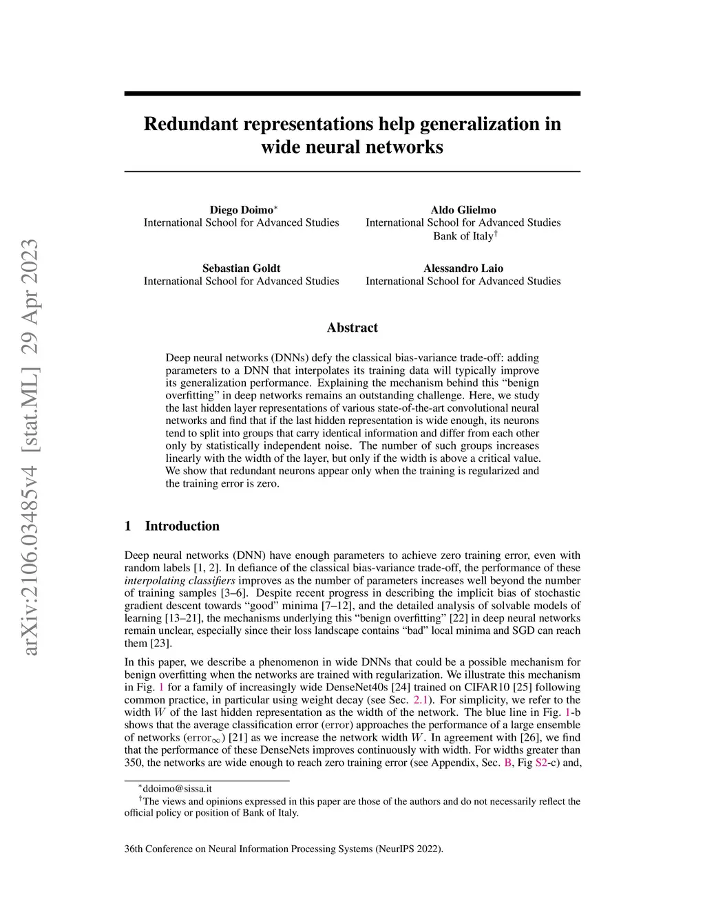 Deep neural networks (DNNs) defy the classical bias-variance trade-off: adding parameters to a DNN that interpolates its training data will typically improve its generalization performance. Explaining the mechanism behind this ``benign overfitting'' in deep networks remains an outstanding challenge. Here, we study the last hidden layer representations of various state-of-the-art convolutional neural networks and find that if the last hidden representation is wide enough, its neurons tend to split into groups that carry identical information, and differ from each other only by statistically independent noise. The number of such groups increases linearly with the width of the layer, but only if the width is above a critical value. We show that redundant neurons appear only when the training process reaches interpolation and the training error is zero.