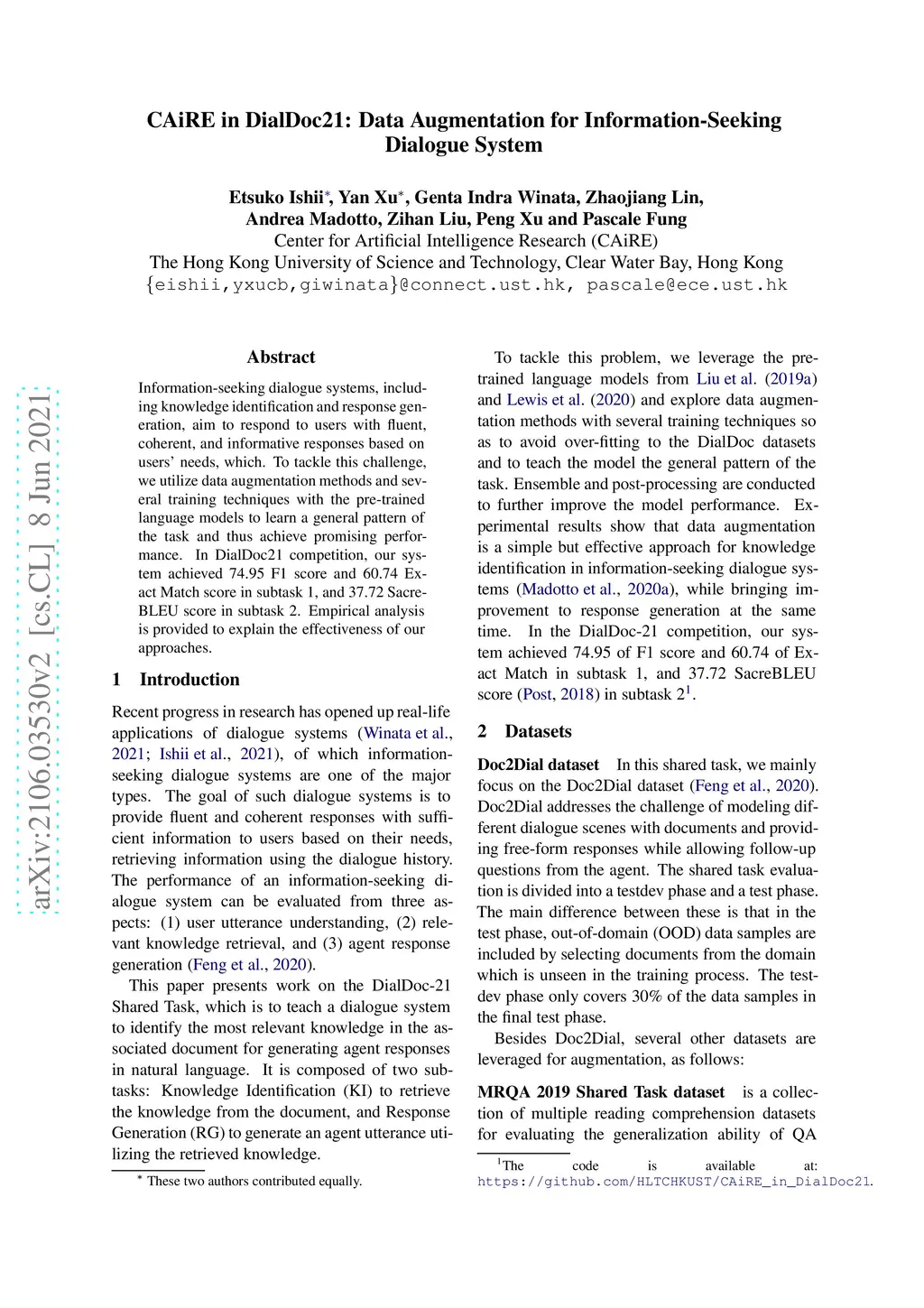 CAiRE in DialDoc21: Data Augmentation for Information-Seeking Dialogue