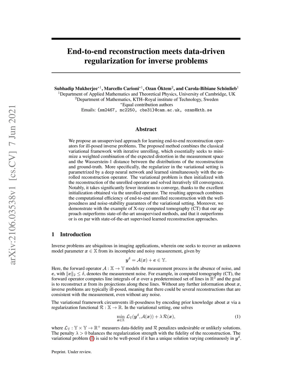 We propose an unsupervised approach for learning end-to-end reconstruction operators for ill-posed inverse problems. The proposed method combines the classical variational framework with iterative unrolling, which essentially seeks to minimize a weighted combination of the expected distortion in the measurement space and the Wasserstein-1 distance between the distributions of the reconstruction and ground-truth. More specifically, the regularizer in the variational setting is parametrized by a deep neural network and learned simultaneously with the unrolled reconstruction operator. The variational problem is then initialized with the reconstruction of the unrolled operator and solved iteratively till convergence. Notably, it takes significantly fewer iterations to converge, thanks to the excellent initialization obtained via the unrolled operator. The resulting approach combines the computational efficiency of end-to-end unrolled reconstruction with the well-posedness and noise-stability guarantees of the variational setting. Moreover, we demonstrate with the example of X-ray computed tomography (CT) that our approach outperforms state-of-the-art unsupervised methods, and that it outperforms or is on par with state-of-the-art supervised learned reconstruction approaches.