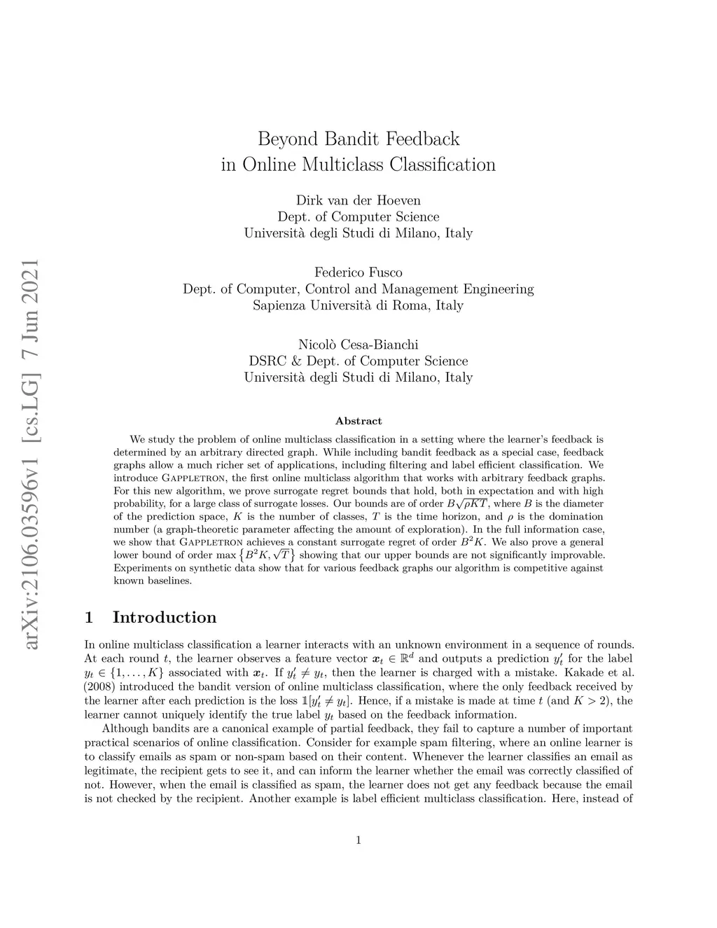 We study the problem of online multiclass classification in a setting where the learner's feedback is determined by an arbitrary directed graph. While including bandit feedback as a special case, feedback graphs allow a much richer set of applications, including filtering and label efficient classification. We introduce Gappletron, the first online multiclass algorithm that works with arbitrary feedback graphs. For this new algorithm, we prove surrogate regret bounds that hold, both in expectation and with high probability, for a large class of surrogate losses. Our bounds are of order , where is the diameter of the prediction space, is the number of classes, is the time horizon, and is the domination number (a graph-theoretic parameter affecting the amount of exploration). In the full information case, we show that Gappletron achieves a constant surrogate regret of order . We also prove a general lower bound of order showing that our upper bounds are not significantly improvable. Experiments on synthetic data show that for various feedback graphs, our algorithm is competitive against known baselines.