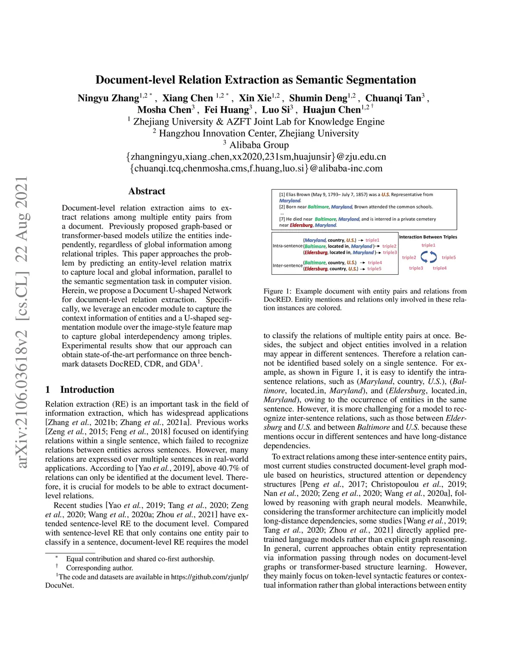 Document-level relation extraction aims to extract relations among multiple entity pairs from a document. Previously proposed graph-based or transformer-based models utilize the entities independently, regardless of global information among relational triples. This paper approaches the problem by predicting an entity-level relation matrix to capture local and global information, parallel to the semantic segmentation task in computer vision. Herein, we propose a Document U-shaped Network for document-level relation extraction. Specifically, we leverage an encoder module to capture the context information of entities and a U-shaped segmentation module over the image-style feature map to capture global interdependency among triples. Experimental results show that our approach can obtain state-of-the-art performance on three benchmark datasets DocRED, CDR, and GDA.