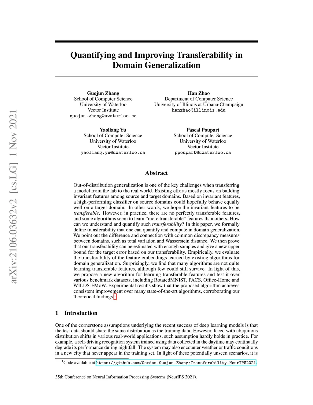 Out-of-distribution generalization is one of the key challenges when transferring a model from the lab to the real world. Existing efforts mostly focus on building invariant features among source and target domains. Based on invariant features, a high-performing classifier on source domains could hopefully behave equally well on a target domain. In other words, the invariant features are \emph{transferable}. However, in practice, there are no perfectly transferable features, and some algorithms seem to learn "more transferable" features than others. How can we understand and quantify such \emph{transferability}? In this paper, we formally define transferability that one can quantify and compute in domain generalization. We point out the difference and connection with common discrepancy measures between domains, such as total variation and Wasserstein distance. We then prove that our transferability can be estimated with enough samples and give a new upper bound for the target error based on our transferability. Empirically, we evaluate the transferability of the feature embeddings learned by existing algorithms for domain generalization. Surprisingly, we find that many algorithms are not quite learning transferable features, although few could still survive. In light of this, we propose a new algorithm for learning transferable features and test it over various benchmark datasets, including RotatedMNIST, PACS, Office-Home and WILDS-FMoW. Experimental results show that the proposed algorithm achieves consistent improvement over many state-of-the-art algorithms, corroborating our theoretical findings.