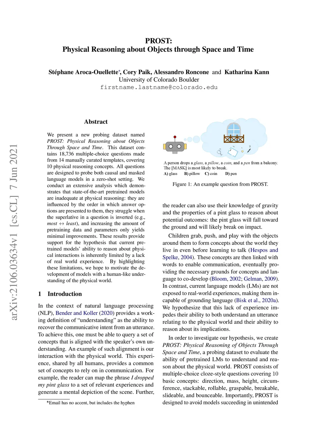 We present a new probing dataset named PROST: Physical Reasoning about Objects Through Space and Time. This dataset contains 18,736 multiple-choice questions made from 14 manually curated templates, covering 10 physical reasoning concepts. All questions are designed to probe both causal and masked language models in a zero-shot setting. We conduct an extensive analysis which demonstrates that state-of-the-art pretrained models are inadequate at physical reasoning: they are influenced by the order in which answer options are presented to them, they struggle when the superlative in a question is inverted (e.g., most <-> least), and increasing the amount of pretraining data and parameters only yields minimal improvements. These results provide support for the hypothesis that current pretrained models' ability to reason about physical interactions is inherently limited by a lack of real world experience. By highlighting these limitations, we hope to motivate the development of models with a human-like understanding of the physical world.