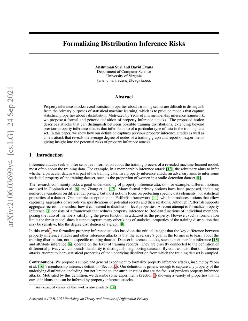 Property inference attacks reveal statistical properties about a training set but are difficult to distinguish from the primary purposes of statistical machine learning, which is to produce models that capture statistical properties about a distribution. Motivated by Yeom et al.'s membership inference framework, we propose a formal and generic definition of property inference attacks. The proposed notion describes attacks that can distinguish between possible training distributions, extending beyond previous property inference attacks that infer the ratio of a particular type of data in the training data set. In this paper, we show how our definition captures previous property inference attacks as well as a new attack that reveals the average degree of nodes of a training graph and report on experiments giving insight into the potential risks of property inference attacks.