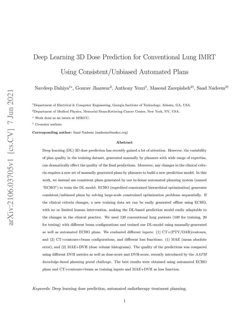 Deep Learning 3D Dose Prediction for Conventional Lung IMRT Using