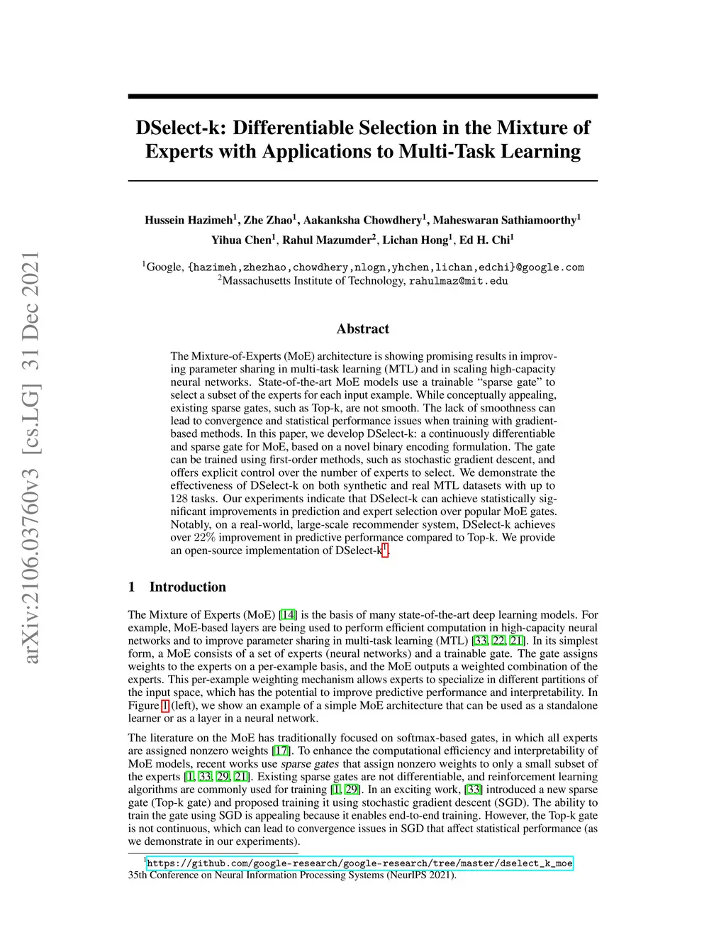 The Mixture-of-Experts (MoE) architecture is showing promising results in improving parameter sharing in multi-task learning (MTL) and in scaling high-capacity neural networks. State-of-the-art MoE models use a trainable sparse gate to select a subset of the experts for each input example. While conceptually appealing, existing sparse gates, such as Top-k, are not smooth. The lack of smoothness can lead to convergence and statistical performance issues when training with gradient-based methods. In this paper, we develop DSelect-k: a continuously differentiable and sparse gate for MoE, based on a novel binary encoding formulation. The gate can be trained using first-order methods, such as stochastic gradient descent, and offers explicit control over the number of experts to select. We demonstrate the effectiveness of DSelect-k on both synthetic and real MTL datasets with up to tasks. Our experiments indicate that DSelect-k can achieve statistically significant improvements in prediction and expert selection over popular MoE gates. Notably, on a real-world, large-scale recommender system, DSelect-k achieves over improvement in predictive performance compared to Top-k. We provide an open-source implementation of DSelect-k.