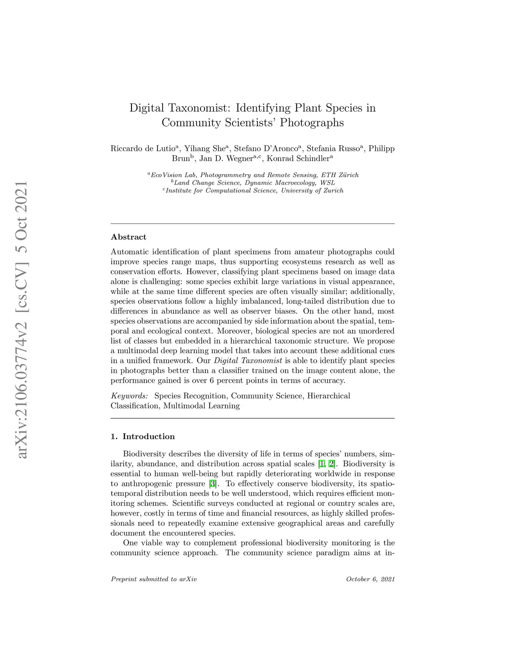 Automatic identification of plant specimens from amateur photographs could improve species range maps, thus supporting ecosystems research as well as conservation efforts. However, classifying plant specimens based on image data alone is challenging: some species exhibit large variations in visual appearance, while at the same time different species are often visually similar; additionally, species observations follow a highly imbalanced, long-tailed distribution due to differences in abundance as well as observer biases. On the other hand, most species observations are accompanied by side information about the spatial, temporal and ecological context. Moreover, biological species are not an unordered list of classes but embedded in a hierarchical taxonomic structure. We propose a multimodal deep learning model that takes into account these additional cues in a unified framework. Our Digital Taxonomist is able to identify plant species in photographs better than a classifier trained on the image content alone, the performance gained is over 6 percent points in terms of accuracy.