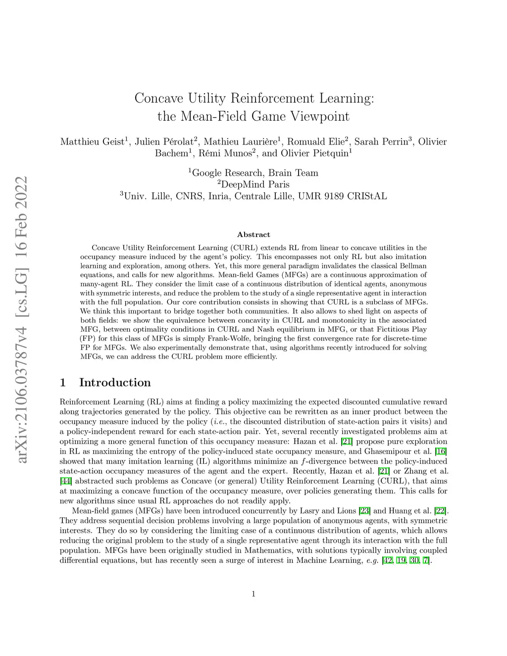 Concave Utility Reinforcement Learning (CURL) extends RL from linear to concave utilities in the occupancy measure induced by the agent's policy. This encompasses not only RL but also imitation learning and exploration, among others. Yet, this more general paradigm invalidates the classical Bellman equations, and calls for new algorithms. Mean-field Games (MFGs) are a continuous approximation of many-agent RL. They consider the limit case of a continuous distribution of identical agents, anonymous with symmetric interests, and reduce the problem to the study of a single representative agent in interaction with the full population. Our core contribution consists in showing that CURL is a subclass of MFGs. We think this important to bridge together both communities. It also allows to shed light on aspects of both fields: we show the equivalence between concavity in CURL and monotonicity in the associated MFG, between optimality conditions in CURL and Nash equilibrium in MFG, or that Fictitious Play (FP) for this class of MFGs is simply Frank-Wolfe, bringing the first convergence rate for discrete-time FP for MFGs. We also experimentally demonstrate that, using algorithms recently introduced for solving MFGs, we can address the CURL problem more efficiently.
