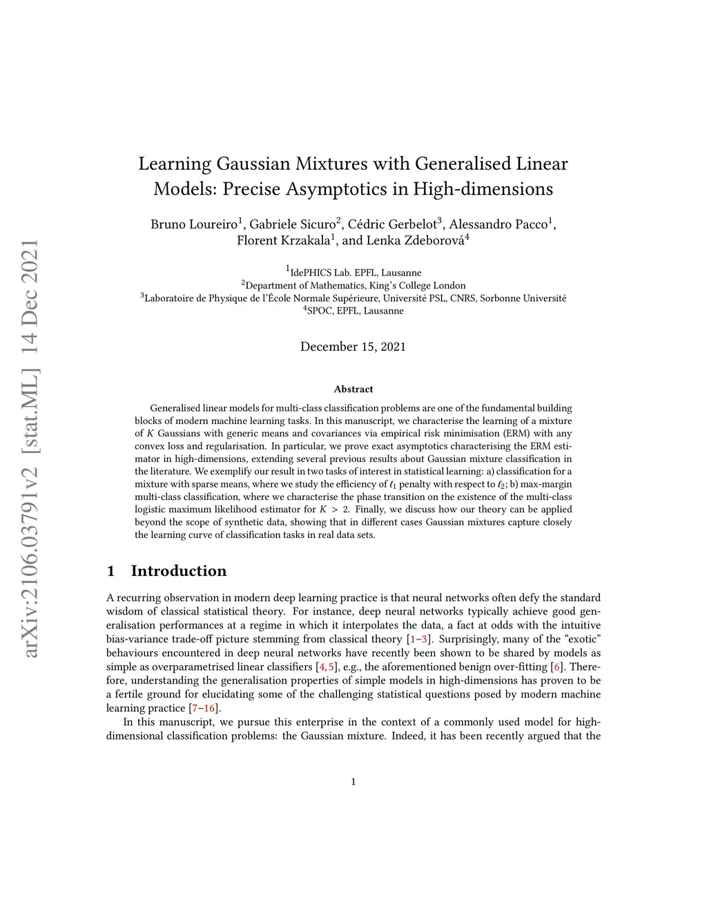 Generalised linear models for multi-class classification problems are one of the fundamental building blocks of modern machine learning tasks. In this manuscript, we characterise the learning of a mixture of Gaussians with generic means and covariances via empirical risk minimisation (ERM) with any convex loss and regularisation. In particular, we prove exact asymptotics characterising the ERM estimator in high-dimensions, extending several previous results about Gaussian mixture classification in the literature. We exemplify our result in two tasks of interest in statistical learning: a) classification for a mixture with sparse means, where we study the efficiency of penalty with respect to ; b) max-margin multi-class classification, where we characterise the phase transition on the existence of the multi-class logistic maximum likelihood estimator for . Finally, we discuss how our theory can be applied beyond the scope of synthetic data, showing that in different cases Gaussian mixtures capture closely the learning curve of classification tasks in real data sets.