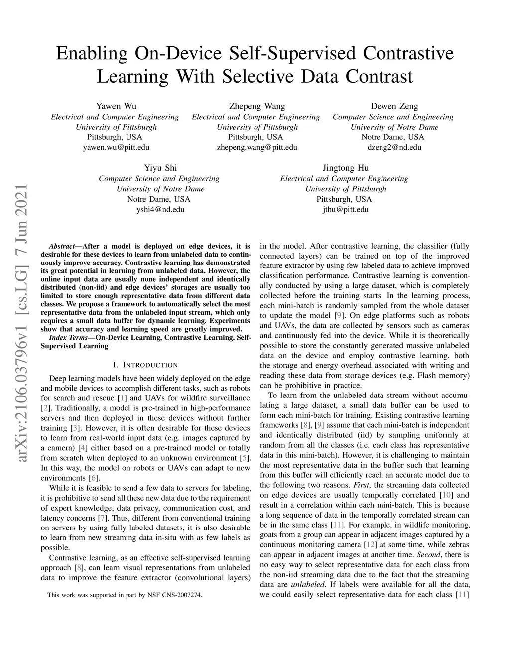 After a model is deployed on edge devices, it is desirable for these devices to learn from unlabeled data to continuously improve accuracy. Contrastive learning has demonstrated its great potential in learning from unlabeled data. However, the online input data are usually none independent and identically distributed (non-iid) and storages of edge devices are usually too limited to store enough representative data from different data classes. We propose a framework to automatically select the most representative data from the unlabeled input stream, which only requires a small data buffer for dynamic learning. Experiments show that accuracy and learning speed are greatly improved.