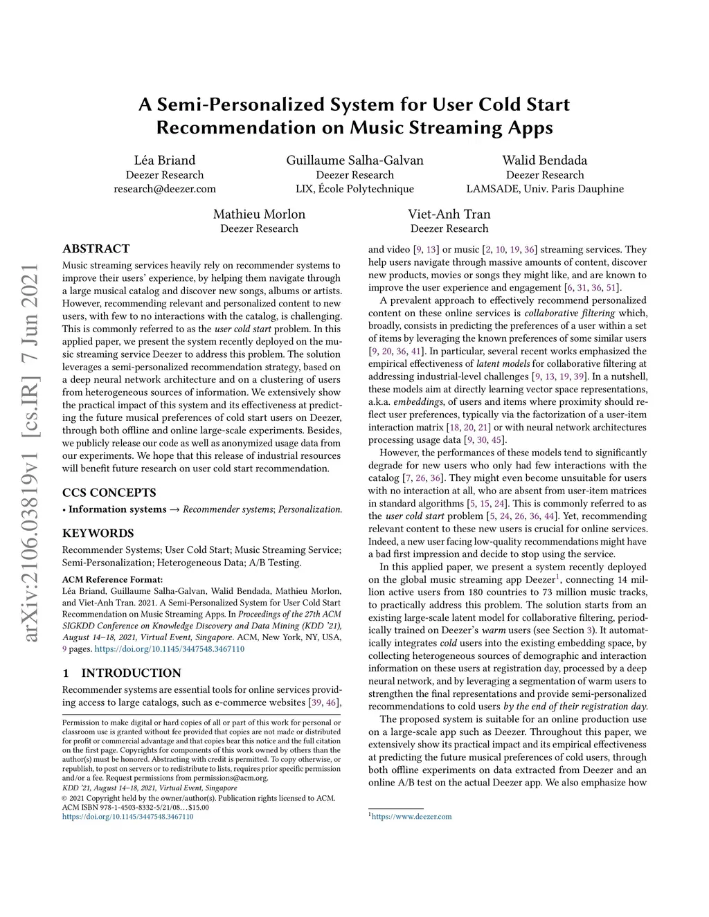 Music streaming services heavily rely on recommender systems to improve their users' experience, by helping them navigate through a large musical catalog and discover new songs, albums or artists. However, recommending relevant and personalized content to new users, with few to no interactions with the catalog, is challenging. This is commonly referred to as the user cold start problem. In this applied paper, we present the system recently deployed on the music streaming service Deezer to address this problem. The solution leverages a semi-personalized recommendation strategy, based on a deep neural network architecture and on a clustering of users from heterogeneous sources of information. We extensively show the practical impact of this system and its effectiveness at predicting the future musical preferences of cold start users on Deezer, through both offline and online large-scale experiments. Besides, we publicly release our code as well as anonymized usage data from our experiments. We hope that this release of industrial resources will benefit future research on user cold start recommendation.