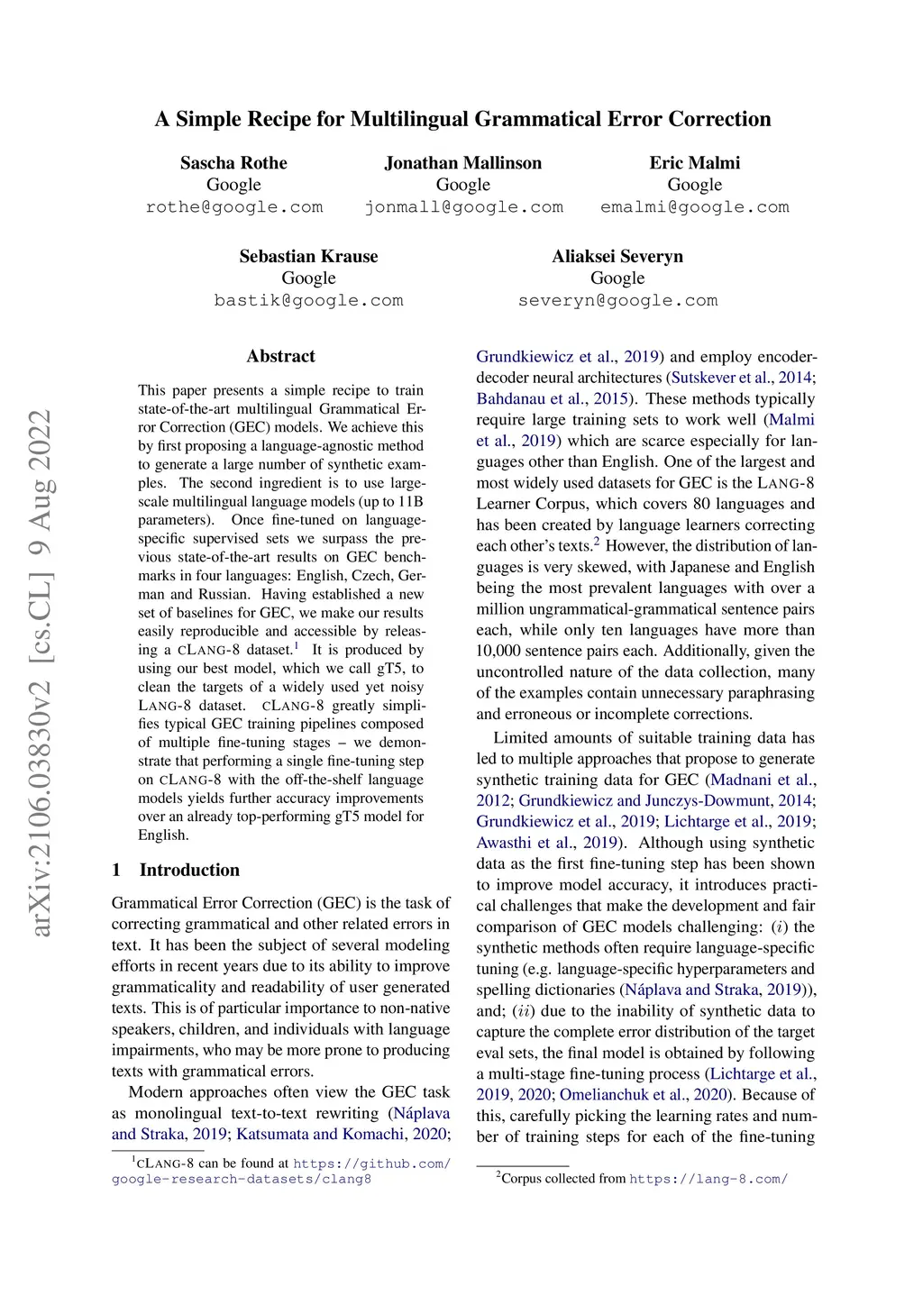 This paper presents a simple recipe to train state-of-the-art multilingual Grammatical Error Correction (GEC) models. We achieve this by first proposing a language-agnostic method to generate a large number of synthetic examples. The second ingredient is to use large-scale multilingual language models (up to 11B parameters). Once fine-tuned on language-specific supervised sets we surpass the previous state-of-the-art results on GEC benchmarks in four languages: English, Czech, German and Russian. Having established a new set of baselines for GEC, we make our results easily reproducible and accessible by releasing a cLang-8 dataset. It is produced by using our best model, which we call gT5, to clean the targets of a widely used yet noisy lang-8 dataset. cLang-8 greatly simplifies typical GEC training pipelines composed of multiple fine-tuning stages -- we demonstrate that performing a single fine-tuning step on cLang-8 with the off-the-shelf language models yields further accuracy improvements over an already top-performing gT5 model for English.