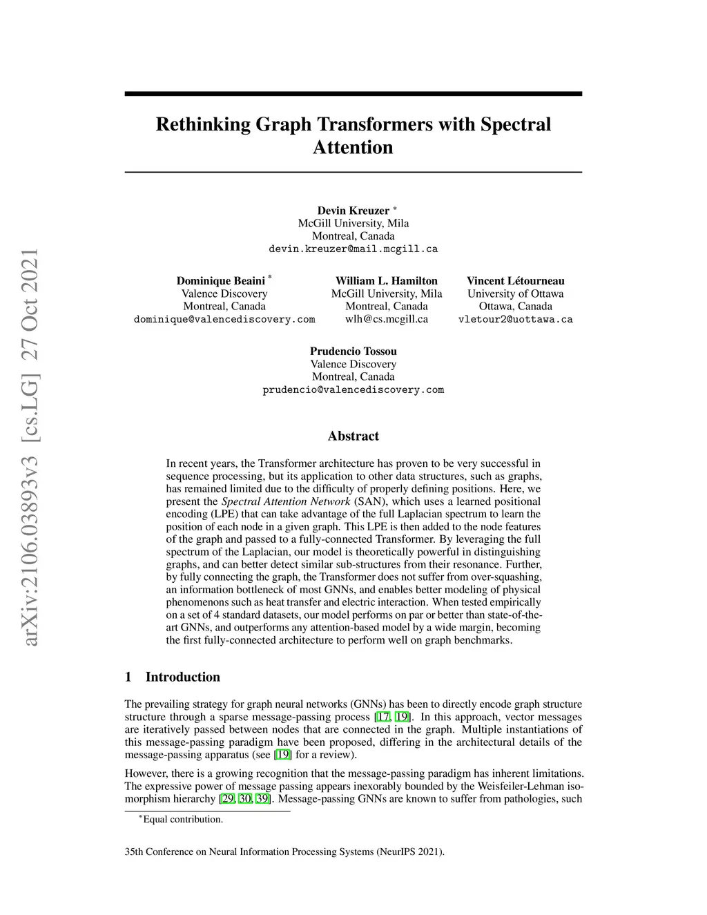 In recent years, the Transformer architecture has proven to be very successful in sequence processing, but its application to other data structures, such as graphs, has remained limited due to the difficulty of properly defining positions. Here, we present the (SAN), which uses a learned positional encoding (LPE) that can take advantage of the full Laplacian spectrum to learn the position of each node in a given graph. This LPE is then added to the node features of the graph and passed to a fully-connected Transformer. By leveraging the full spectrum of the Laplacian, our model is theoretically powerful in distinguishing graphs, and can better detect similar sub-structures from their resonance. Further, by fully connecting the graph, the Transformer does not suffer from over-squashing, an information bottleneck of most GNNs, and enables better modeling of physical phenomenons such as heat transfer and electric interaction. When tested empirically on a set of 4 standard datasets, our model performs on par or better than state-of-the-art GNNs, and outperforms any attention-based model by a wide margin, becoming the first fully-connected architecture to perform well on graph benchmarks.
