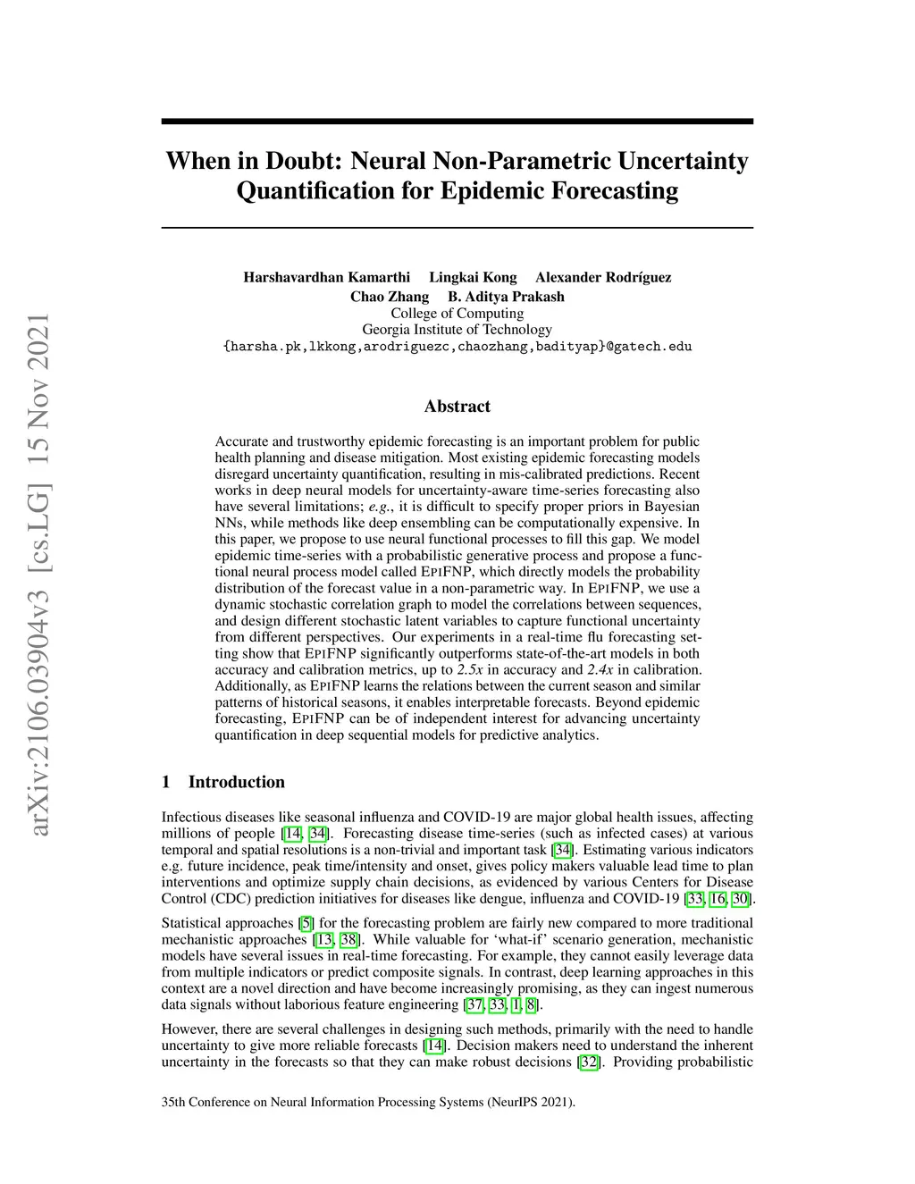 Accurate and trustworthy epidemic forecasting is an important problem that has impact on public health planning and disease mitigation. Most existing epidemic forecasting models disregard uncertainty quantification, resulting in mis-calibrated predictions. Recent works in deep neural models for uncertainty-aware time-series forecasting also have several limitations; e.g. it is difficult to specify meaningful priors in Bayesian NNs, while methods like deep ensembling are computationally expensive in practice. In this paper, we fill this important gap. We model the forecasting task as a probabilistic generative process and propose a functional neural process model called EPIFNP, which directly models the probability density of the forecast value. EPIFNP leverages a dynamic stochastic correlation graph to model the correlations between sequences in a non-parametric way, and designs different stochastic latent variables to capture functional uncertainty from different perspectives. Our extensive experiments in a real-time flu forecasting setting show that EPIFNP significantly outperforms previous state-of-the-art models in both accuracy and calibration metrics, up to 2.5x in accuracy and 2.4x in calibration. Additionally, due to properties of its generative process,EPIFNP learns the relations between the current season and similar patterns of historical seasons,enabling interpretable forecasts. Beyond epidemic forecasting, the EPIFNP can be of independent interest for advancing principled uncertainty quantification in deep sequential models for predictive analytics